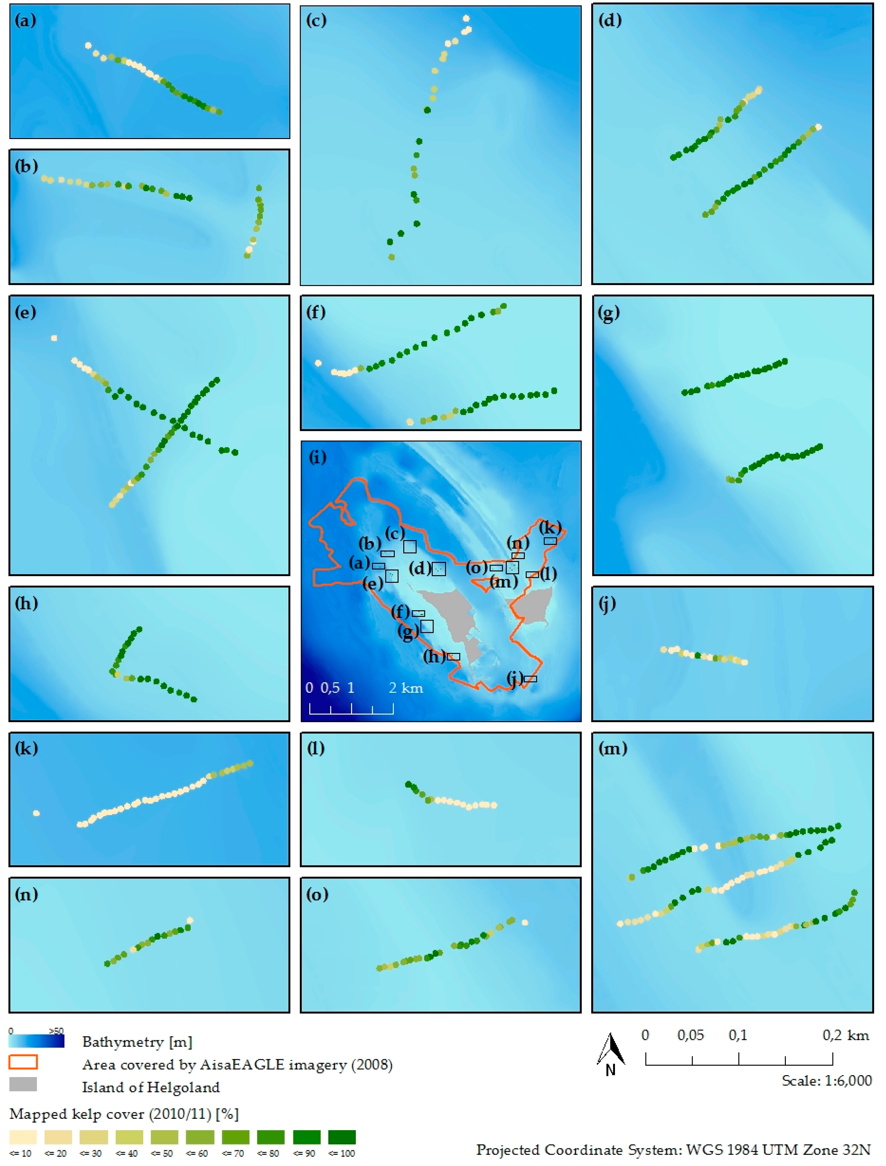 Overview of diving transects (a–h), flight stripe cover of the study area (i) and overview of diving transects (j–o); the colouring indicates the percentage cover of kelp mapped by the divers.