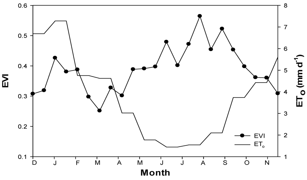ET has been accurately estimated by combining MODIS EVI with knowledge of atmospheric water demand, as estimated by at a number of agricultural and riparian phreatophyte communities in diverse locations [42,43]. We used an algorithm derived from the crop-coefficient method of estimating ET of agricultural crops, where: