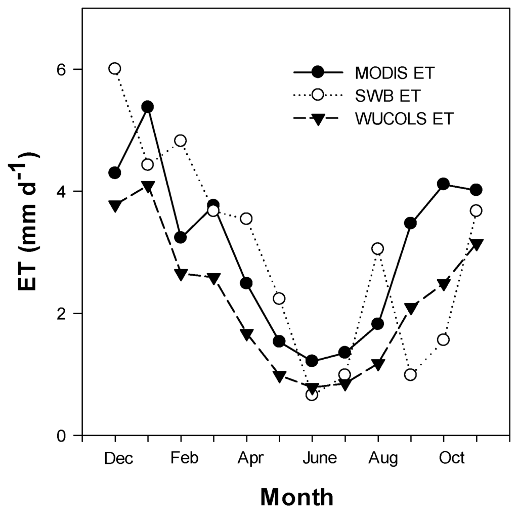 Both the MODIS and WUCOLS adequately captured the seasonality of ET at Veale Gardens, with highest values in December (Australian summer) and lowest in June (Australian winter) (Figure 4). The SWB estimates were more variable month to month than the WUCOLS and MODIS estimates.
