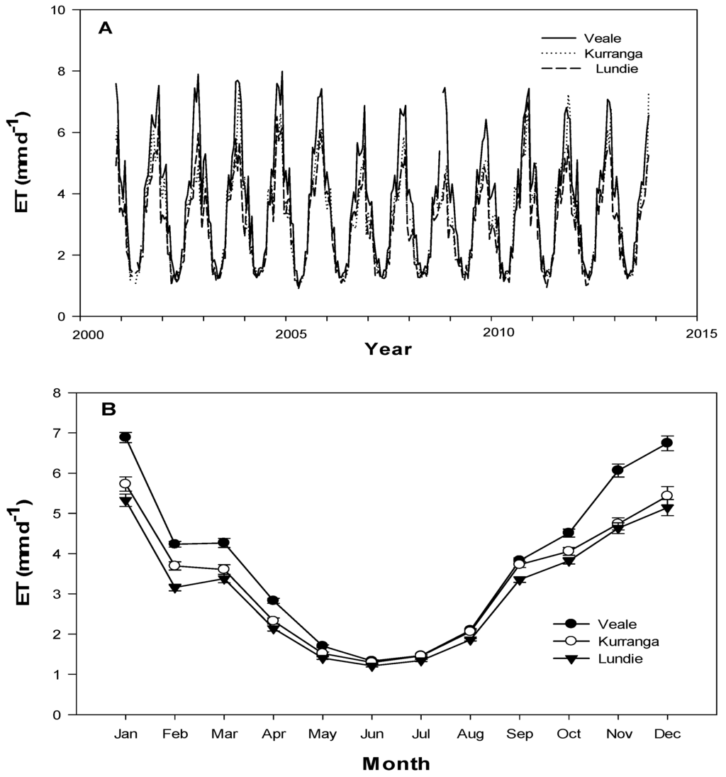 (A) ET estimated by MODIS EVI at 16-day intervals, 2000 to 2013, for three adjacent park areas in Adelaide, Australia; (B) Monthly ET values averaged over all years for the same sites. Error bars are standard errors over years.