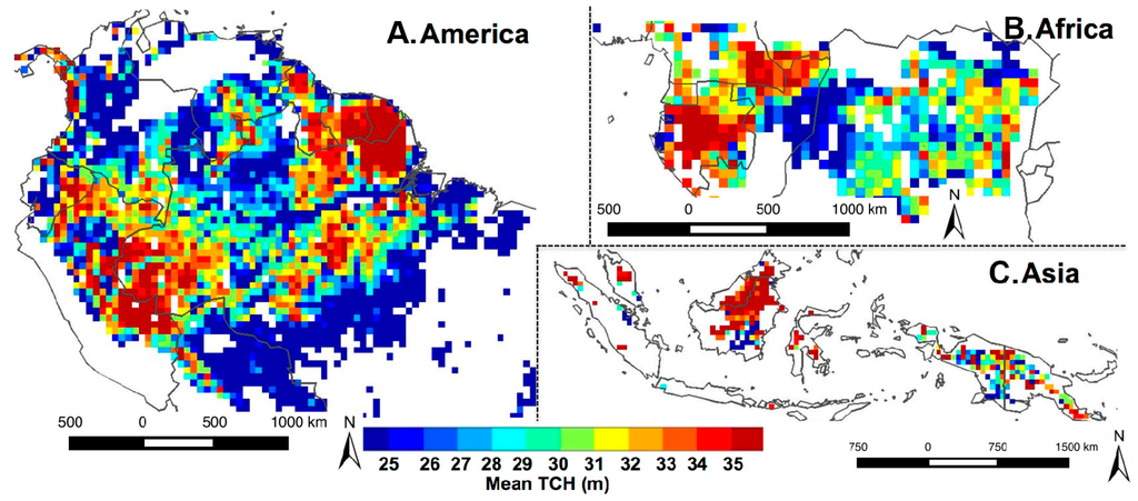 To understand and quantify the variability and the controls on forest mean and maximum tree height in tropical forests, a systematic observation of tree height is required. Existing ground observations documented in research networks of plots have contributed significantly in understanding the local characteristics of forest structure [3,21]. However, the plot networks are not designed to provide enough samples on regional or continental scale variations. Alternatively, remote sensing techniques can provide systematic observations of tropical forest structure using recently advance active sensors such as lidar (Light Detection and Ranging) and radar (Radio Detection and Ranging) from airborne and spaceborne platforms [27,28,29].