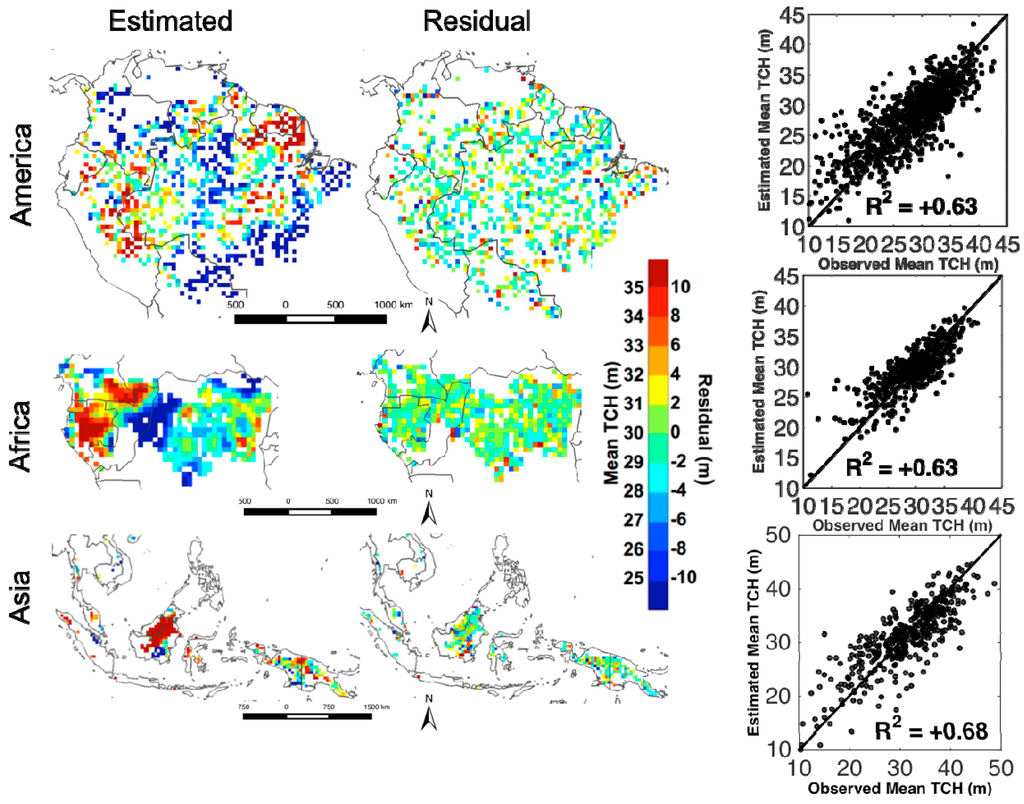 In our analysis the underestimation of TCH using climate-only data is not resolved. In fact, we can see both underestimation of high TCH and overestimation of low TCH, suggested by the regressions analyses (Figure 2). This is probably due to: (1) land use changes creating heterogeneous and fragmented landscapes with variations in tree height at small scale that are not captured by the land cover map but can be detected by lidar footprints. Although we filtered the GLAS lidar based on the land cover types, but a significant number of GLAS footprints over fragmented landscapes may still remain in the mix; (2) there are other controls not considered in this analysis, such as disturbances including logging, disease and wildfires, that drive the growth of tall trees. Essentially, tree height is related to its age, especially when the tree is not mature yet. The forest turnover rate is high in areas where it is easily accessible (close to road, river, population, or in low elevation) [64]. Given the same conditions of climate, soil and topographic features, the areas with high disturbances could have lower tree heights that are not detectable from our current regression model.