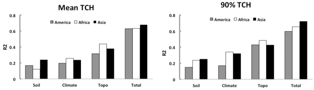 Soil properties have less influence on variations of TCH compared to either the climate or the geographical features. However, individual properties present nonnegligible impacts on TCH variations. Clay content, as a physical structural property of soil, exhibits a significantly positive relationship to both TCH metrics in all continents. Cation-exchange capacity (CEC), a well-known chemical property and a measure of soil fertility, is also a significant factor in Africa and Asia for TCHm, and in America and Asia for TCH90. A general chemical measure, pH value, shows significant but completely opposite effects on TCH metrics in America than other continents, with pH value negatively correlated to TCHm and TCH90 in Americas, but positively correlated in Africa and Asia. For other soil biological properties, we find that the soil organic carbon (OC) content has a strong negative correlation on TCH metrics in America, while it shows positively correlated with TCHm in Africa, and less clear in Asia.