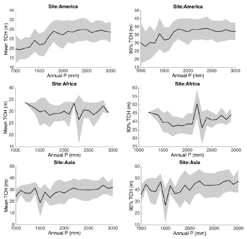 Results from our study suggest that mean annual properties of climate in humid tropical regions such as annual mean and total precipitation do not exert any significant control or limit both the mean and 90 percentile of forest canopy height across the three continents. Similarly, annual mean temperature has no significant effect on the mean tree height variations. Our findings suggest that the spatial distribution of mean canopy structure in humid tropical forests are not strongly dependent on the mean climate characteristics. Although the relationship between TCH metrics and annual precipitation (Figure 4) demonstrate that TCH metrics increase with rainfall within a certain precipitation range (1000 mm to 2000 mm), particularly in the American forests, most observations from humid tropical forests are located in the plateau area (precipitation > 2000 mm), thus making these mean/total climate variables less important compared to other climate variables such as seasonality parameters and extreme values. Note that in the model selection process, mean climate variables were rarely included as important predictor variables (except in the case of TCHm in America).