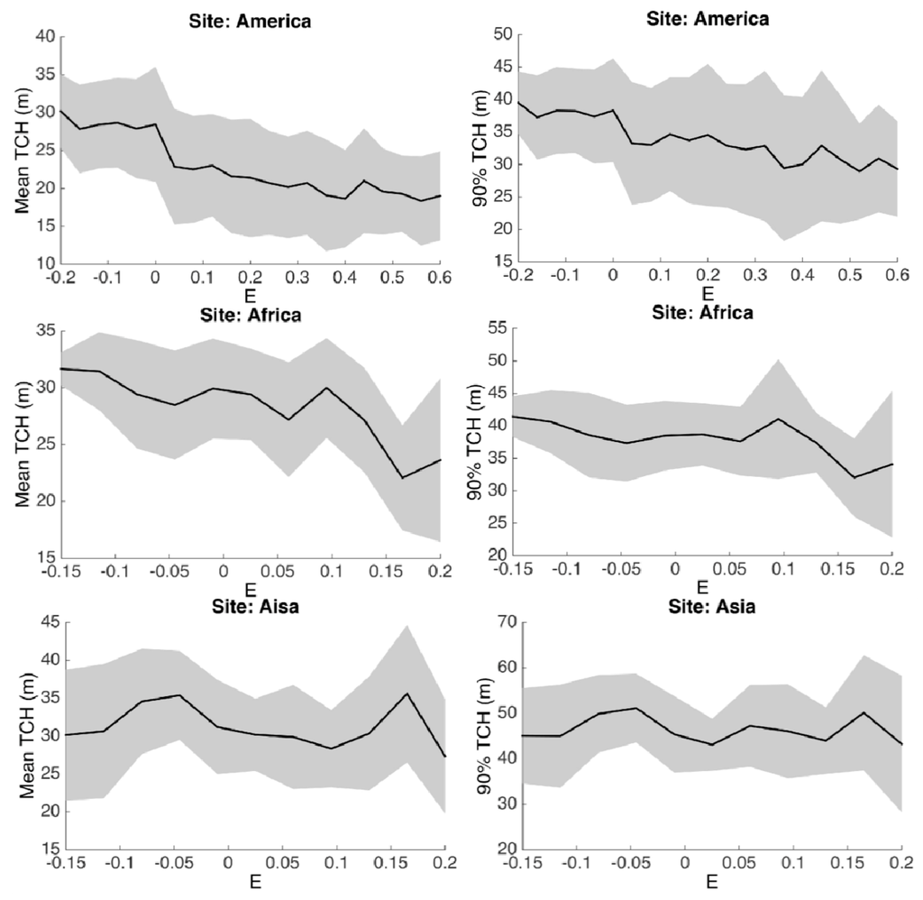 Tree height (TCHm and TCH90) variations with E factor. The E factor is one of the most significant climate variables in the spatial regression results of TCH90 across all continents. The height metrics are binned up to 20 groups along the E factor axis to get the mean and standard deviation.