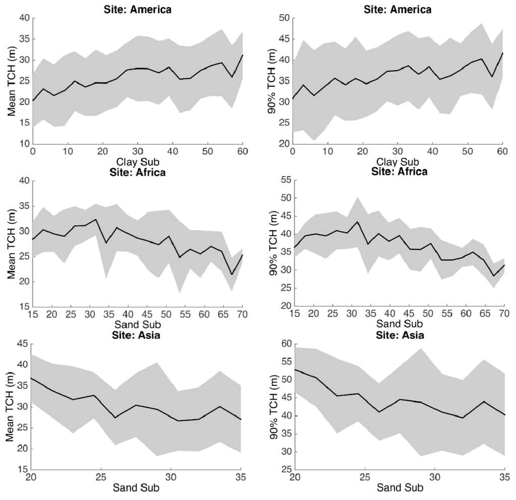 Tree height (TCHm and TCH90) variations with soil physical properties. The clay content in America and sand content in Africa and Asia are selected as they are all significant variables in the spatial regression results. The height metrics are binned up to 20 groups along the X axis to get the mean and standard deviation.