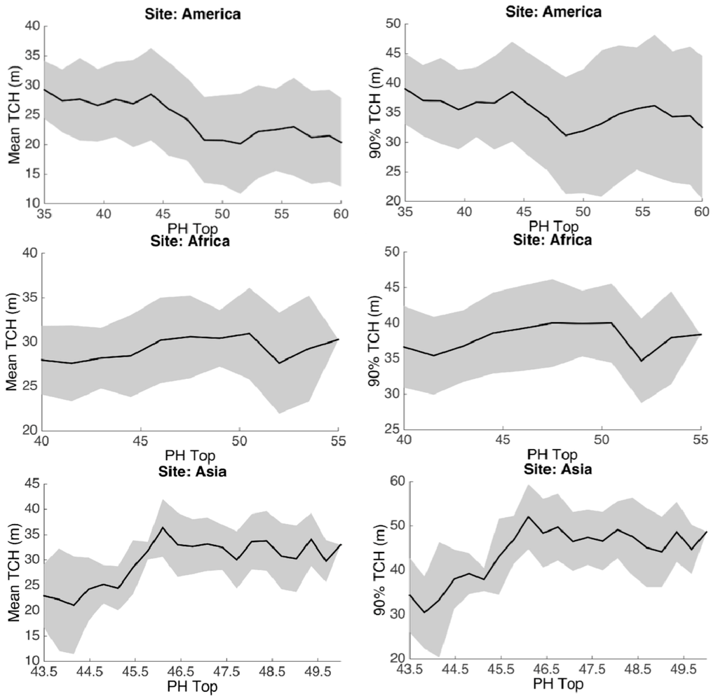Recent studies of modeling efforts on the prediction of tropical forest biomass and productivity always present a biased estimation of large trees due to the limited or simplified resource information regulating the growth of forest [60]. We thus included the soil properties in our analyses and attempted to find evidences of edaphic controls on tropical tree height. Although the overall importance of soil on TCH is approximately half of that of climate (Figure 3), the TCH variations are statistically related to the changes of soil properties. In all regression results, TCHm and TCH90 show a significantly positive relationship to the soil physical property–clay content of either topsoil or subsoil. The results support the typical functionality of clay content in soil that (1) it has a relatively large nutrient capacity; (2) it can hold enough water for root absorption, and (3) it potentially has the structural strength to fix the roots of large trees [61]. The one-to-one relationships of TCH and soil physical property demonstrate a positive trend of TCH with clay content in America, as well as a negative relationship between TCH and sand in Africa and Asia (Figure 6). We plotted sand instead of clay content in Africa and Asia due to the fact that clay content has less dynamic ranges in these two continents. However, the variation of sand content should compensate the changes of clay, as sand, silt and clay together describe the soil texture. Another significant control of the soil is the negative relationship between TCHm and the soil fertility–CEC. It is seemingly counterintuitive, that mature forests with taller trees are actually located on less fertile soil. However, the result is corroborated by several previous findings in the Amazon basin–forests with largest above ground biomass occur on relatively poor soils [17]. Although the total CEC may not be an ideal indicator of fertility due to the inclusion of aluminum, such negative relationship can potentially be explained by the faster turnover rates for forests with high soil fertility [17]. In contrast, we found positive relationships between pH values and TCHm both Africa and Asia, though CEC should be highly dependent on the pH values. We also found this behavior of pH by plotting the one-to-one relationships of TCH vs pH values (Figure 7). The underlying reasons for these differences remain unclear. Possible explanation could be that the forests in Africa and Asia are in favor of the basic environment to allow more base cations (Ca, Mg, K and Na) rather than Al and H+ ions under high acidity, which may be explained by the less factions of Ferralsol found in Africa and Asia [62]. If we consider the combined effect of pH and CEC as the indicator of the soil fertility, then similar observations on the continental differences have been reported in other studies [63]. The last soil factor that can explain the TCH distribution at macroscale is the soil organic carbon (OC). Interestingly, the sensitivity of OC to TCH varies continent by continent. In America, OC is negatively related to both TCHm and TCH90, while it is positively correlated to TCHm in Africa. In addition, these relationships are less obvious for the TCH90 in either Africa or Asia.