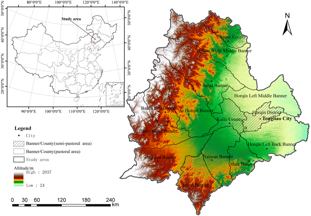 The study area was the Horqin Sandy Land (41°41′32″–46°12′34″N, 117°49′42″–123°42′37″E), located in the southeast of the Inner Mongolian Autonomous Region, China (Figure 1). It covers an area of about 130,390 km2 and comprises 14 banners (counties or cities). The Horqin Sandy Land is a transitional zone between the Inner Mongolian Plateau and the Northeast China Plain that has a temperate subhumid and semiarid monsoon climate [41]. Precipitation is about 340–450 mm/a, the annual average temperature is 5.8–6.4 °C, and the annual average wind velocity is 3.5–4.5 m/s. The landscape in the Horqin Sandy Land is characterized by sand dunes alternating with gently undulating meadows. Soil on the sand dunes is sandy in texture, light in color, loose in structure, and susceptible to wind erosion. The undisturbed vegetation on the sand dunes within the area is composed of Stipa grandis, Leymus chinensis, and Agropyron cristatum communities with sparsely scattered woods (mainly Ulmus pumila), although the area is now dominated by Artemisia halodendron communities. A large area of meadow between the sand dunes has been cultivated to cropland. The Horqin Sandy Land is typical of a transitional zone between semi-pastoral areas (south of the study area, six banners) and pastoral areas (north of the study area, eight banners) (Figure 1).
