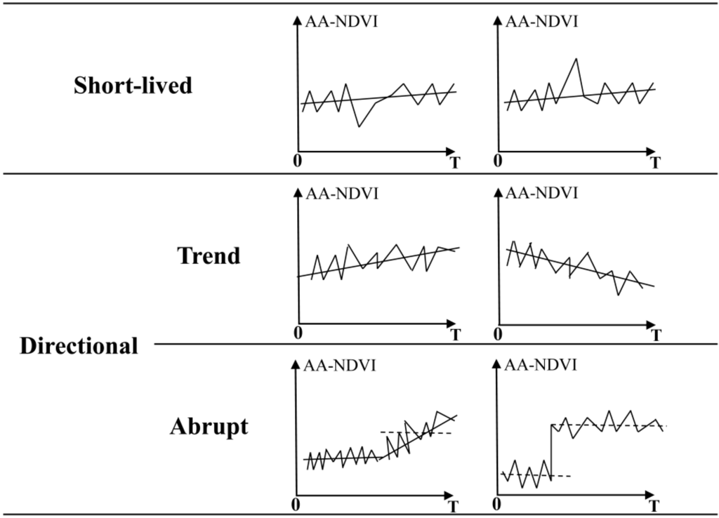 ACs are usually related with land cover type changes and mainly caused by human activities such as reforestation, deforestation, urbanization, and land reclamation. Their NDVIs will change abruptly. For TCs, land cover types generally remain the same and are often related with changes in the status of the growing plants or in the species composite due to global warming, soil erosion [12,13,14,15], desertification, or water erosion. Their NDVIs will change slowly but continuously. It should be pointed that TCs will not be analyzed further if ACs happened in a trajectory because we believe that the TCs were affected greatly by ACs in these trajectories.