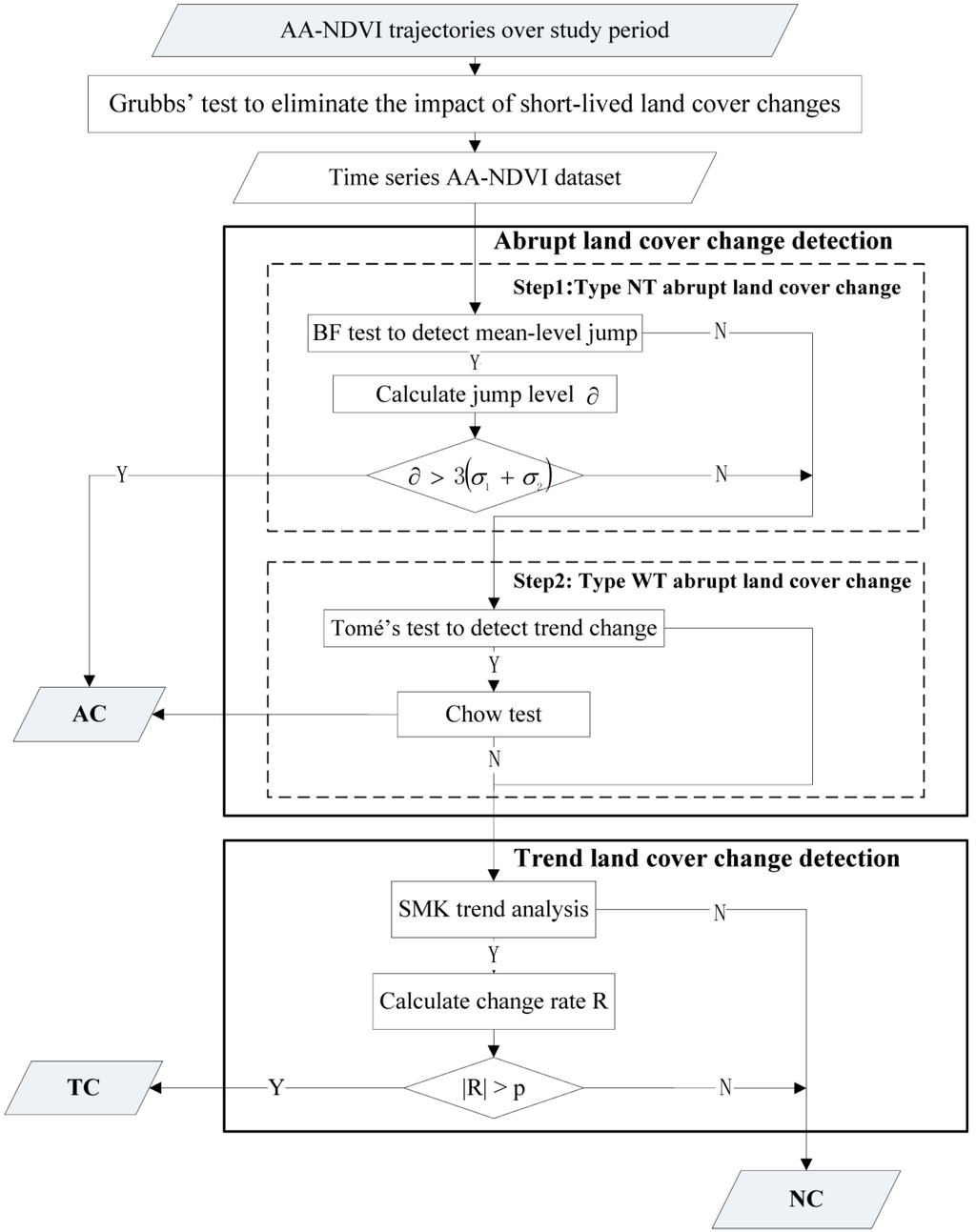 To overcome these two problems, this study proposed a multi-target hierarchical detection (MTHD) method to detect different types of directional land cover changes simultaneously and automatically. Land cover changes were classified into short-lived change (SC) and directional change (DC) [15], and the DC category was classified further into abrupt change (AC) and trend change (TC). The MTHD method used a hierarchical strategy to detect SC and DC (including both AC and TC), successively. Based on the annual aggregated NDVI (AA-NDVI) over the growing season, we used Grubbs’ test to eliminate SCs by considering them outliers in the time series. Then, the Brown-Forsythe (BF) [36,37] test and the combination of the Tomé’s method [38,39] and Chow test [40] were applied to determine ACs, such that the impact of frequent and strong interannual variations could be reduced. Finally, the SMK method was used to detect the trend changes of land cover.