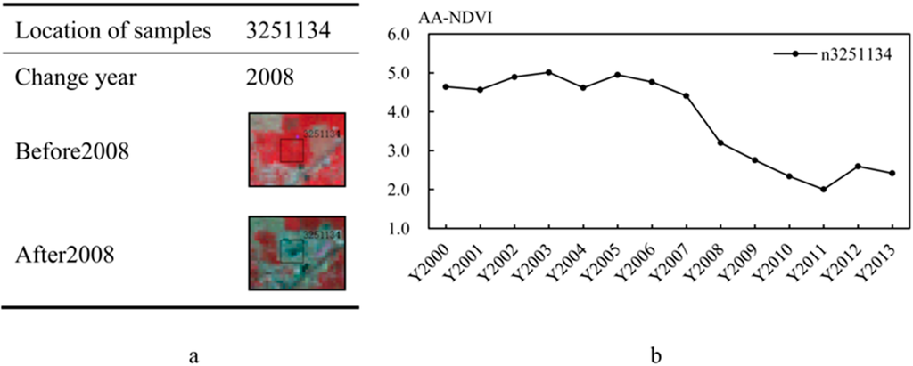 Validation of change detection results is notoriously difficult because ground truth data of historical land cover changes are usually unavailable [9,18,32]. In this study, we mainly used remote sensing images with high spatial resolutions (30 m or higher) to validate the abrupt changes in land cover because of their relatively fine and accurate representation [9,18]. We obtained the validation data through visual interpretation of the remotely sensed images. The profiles of the AA-NDVI trajectories were also used to help in understanding the land cover changes (Figure 4). Field visits and interviews were also conducted in August 2015, such that a clear relationship between the present and historical images could be confirmed for all sample points.