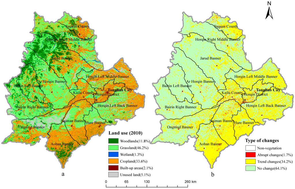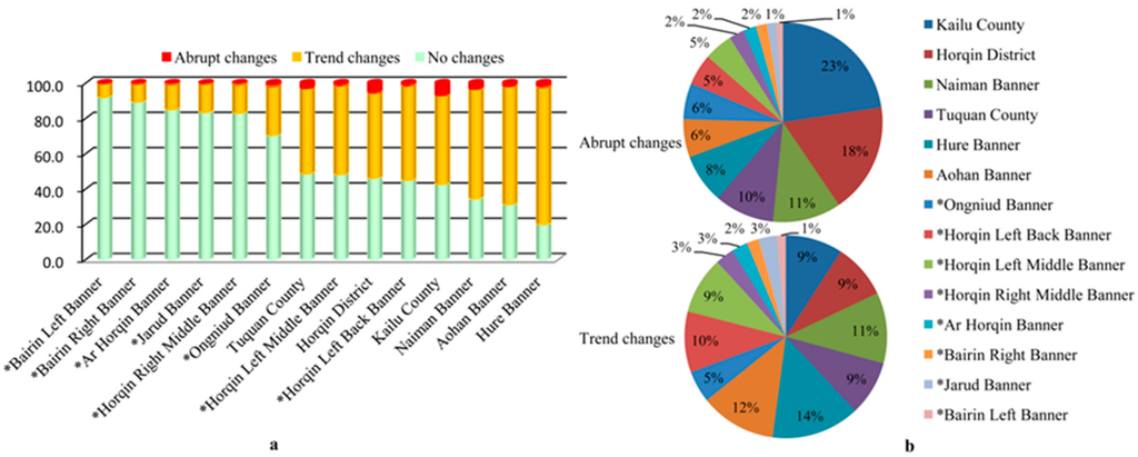 The NDVI indicated the trend in cropland more clearly than in grassland (Table 3). The areas of cropland and grassland in 2010 were 49,149.9 and 67,562.2 km2, respectively. However, their areas of trend change were 21,336.9 and 15,140.7 km2, accounting for 43.4% and 22.4%, respectively, of their total areas; i.e., the percentage of cropland indicating trend land cover change was nearly twice that of grassland.