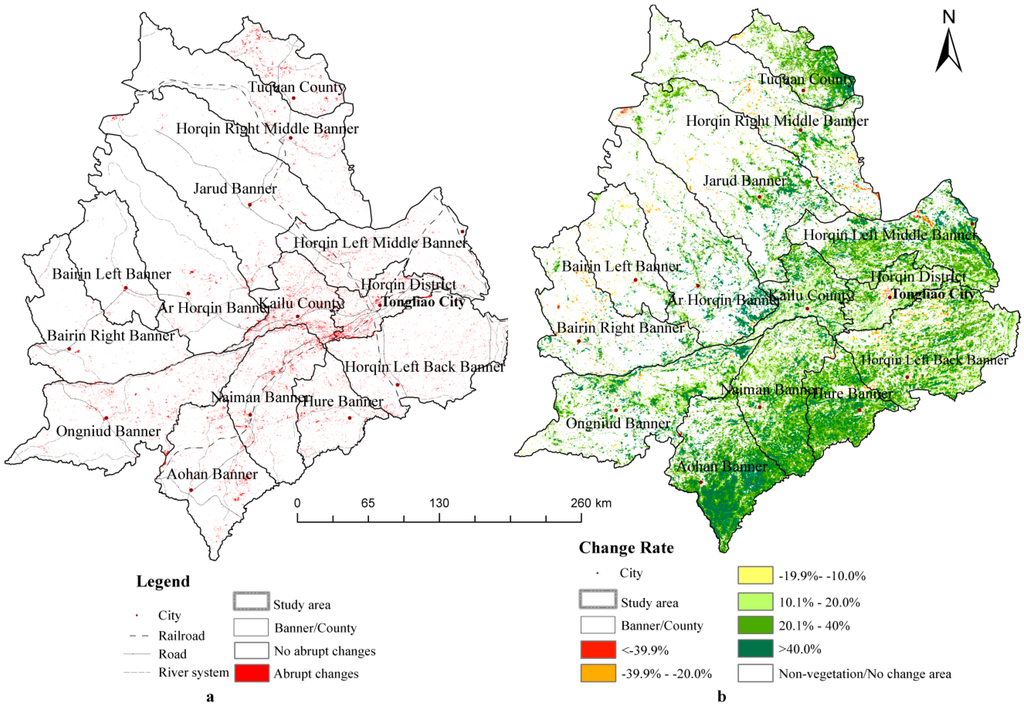 The NDVIs clearly indicated a positive trend in the trend land cover changes. The area in which the NDVIs indicated a positive trend was 4246.2 km2 (95.3% of the total area of trend land cover changes). The NDVIs indicated a negative trend for only 2112.7 km2 (4.7% of the total area of trend land cover changes). The area in which the NDVI increased by >20% during the study period was 33,230.4 km2 (74.5% of the total area of trend land cover changes). The area in which the NDVI decreased by >20% during the study period was 1184.3 km2 (2.5% of the total area of trend land cover changes).