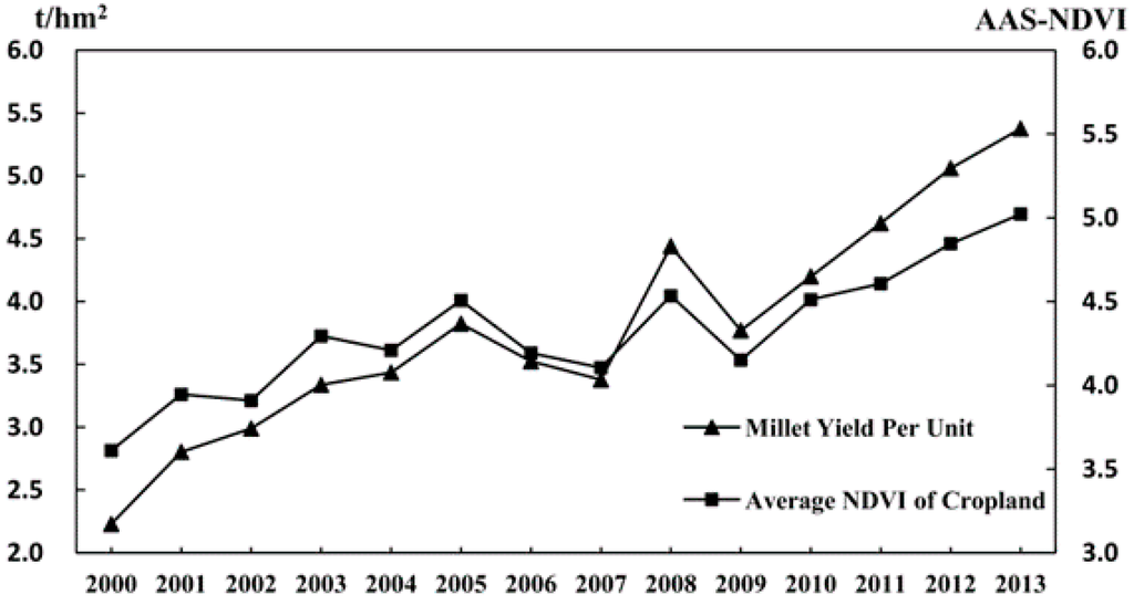 Because the validation of the trend change based on ground truth data was unrealizable until now [32], we can only give some benchmark for the land cover change detection. In this study, two methods were used: (1) consistency evaluation of NDVI change trends over the study period between LTS and MODIS datasets; and (2) consistency evaluation between millet yield per unit and average NDVIs of cropland for each banner.