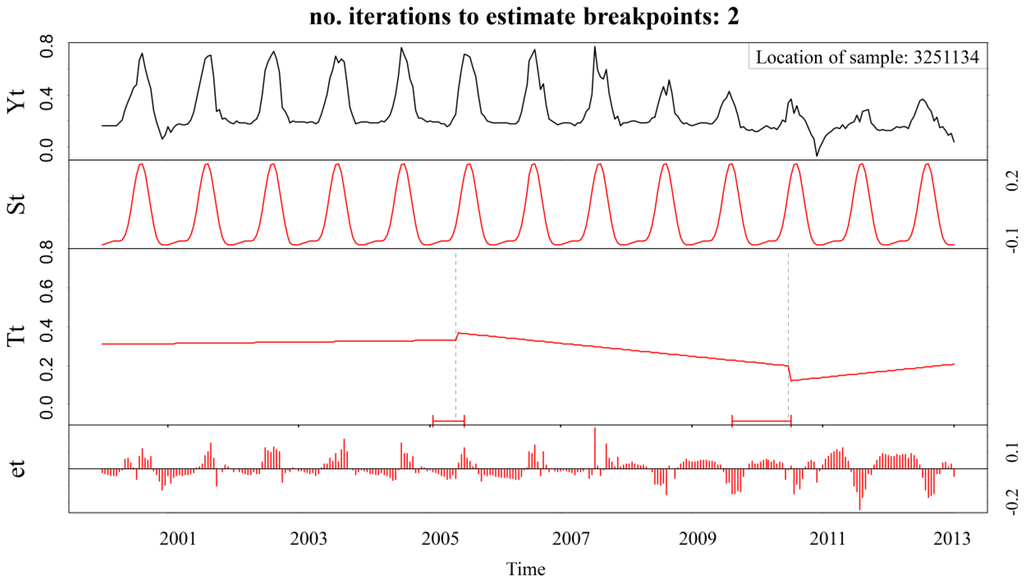 Although detailed changes can be acquired using these methods, it is very difficult to relate them automatically to specific ecosystem changes [32,34]. This is because the detected changes could be caused by transient periods of drought or flood that do not have long-lasting effects on the ecosystems, or by directional changes of the ecosystems that do have durable effects, including both abrupt and trend land cover changes. Thus, users can have difficulty in identifying the changes of concern and in determining their underlying driving factors. Furthermore, both the BFAST and DBEST methods determine the numbers and locations of abrupt points depending on the optimal overall goodness-of-fit of the entire time series using a minimized Bayesian Information Criterion. Therefore, NDVIs of points with relatively large residuals in a trajectory could influence the overall fitting performance of the series, making these points more likely to be chosen as abrupt change points. However, the NDVIs of these points might simply be normal fluctuations, especially in a time series with frequent and strong interannual variations. As discussed above, there are two fundamental problems to be addressed when using the BFAST and DBEST methods. The first is to relate the detected changes to specific ecosystem changes, and the second is to establish a robust means by which to determine the abrupt change points in a time series with frequent and strong interannual variations.
