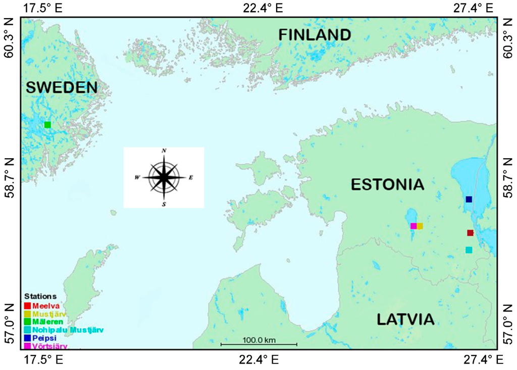 Field measurements were carried out during three years 2011–2013. The total number of sampling stations was 105. The extreme CDOM-rich lakes Mustjärv and Nohipalu Mustjärv were sampled once, Meelva twice. Data from the other boreal lakes was collected in the frame of different projects. Lake Mälaren in Sweden was sampled once (7 sampling stations) while three Estonian lakes were studied almost on the monthly bases during three ice free seasons. We sampled Lake Võrtsjärv 9 times (19 samples in total), Lake Harku 11 times (one station each time), and Lake Peipsi 11 times (65 samples in total).