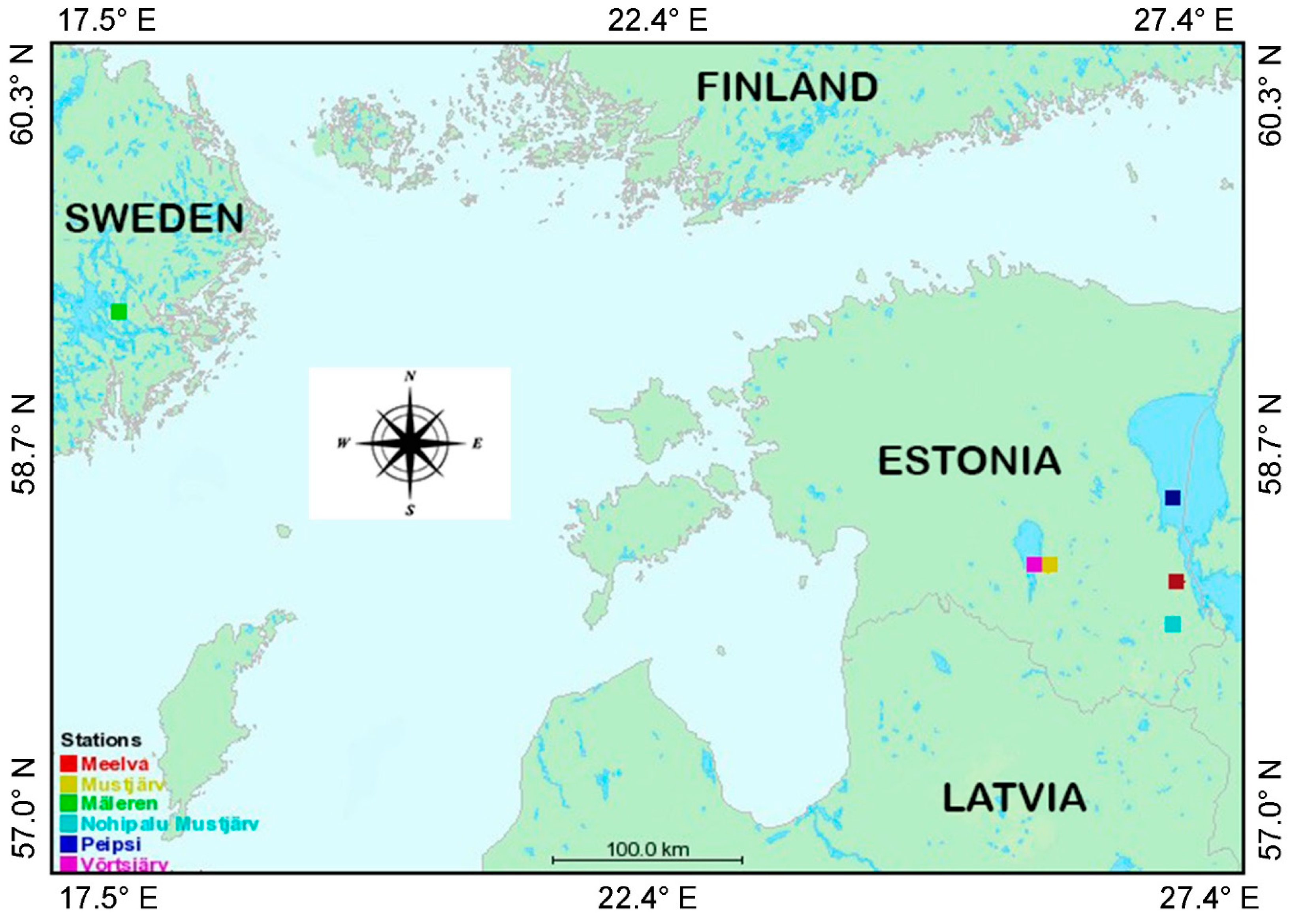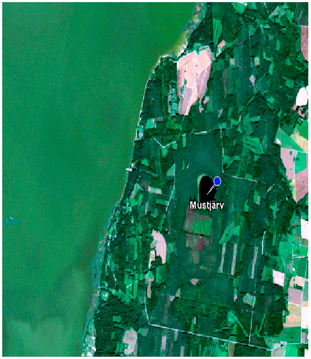 We chose three nearly black water lakes in South-Eastern Estonia for our study—Nohipalu Mustjärv, Meelva, and Mustjärv (Figure 1). These lakes were chosen based on our previous knowledge about the optical water properties there. The lakes are small—their area varies between 0.2 km2 and 0.8 km2.