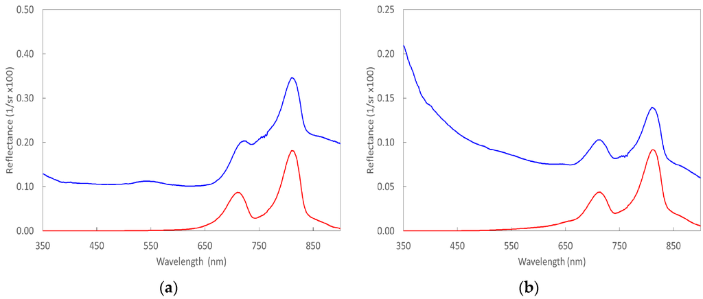 There are studies [42] showing that the 810 nm peak is suitable for mapping water depth in very shallow (less than 1 m deep) waters. This is reasonable as benthic vegetation has high reflectance in NIR part of spectrum [43,44] and there is a decrease in water absorbance at 810 nm making the bottom signal detectable in this spectral region. All reflectance measurements of this study were carried out in optically deep waters with no bottom contribution. Therefore, we are sure that the height of the 810 nm peaks is only due to water constituents and there is no contribution from benthic vegetation.