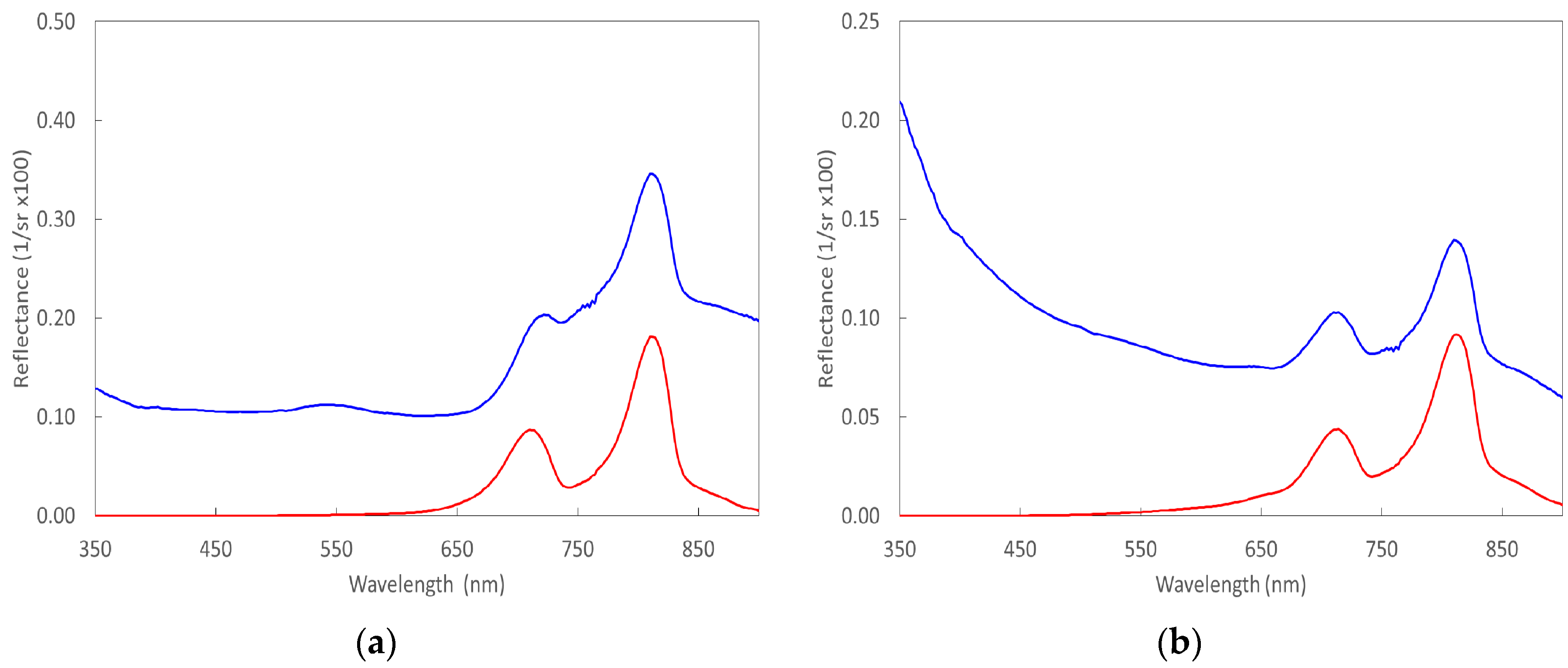 The second peak height was calculated simply as the difference between the reflectance value at 810 nm and the 770–840 nm baseline as the location of the maximum value was always at 810 nm (Equation (2)).