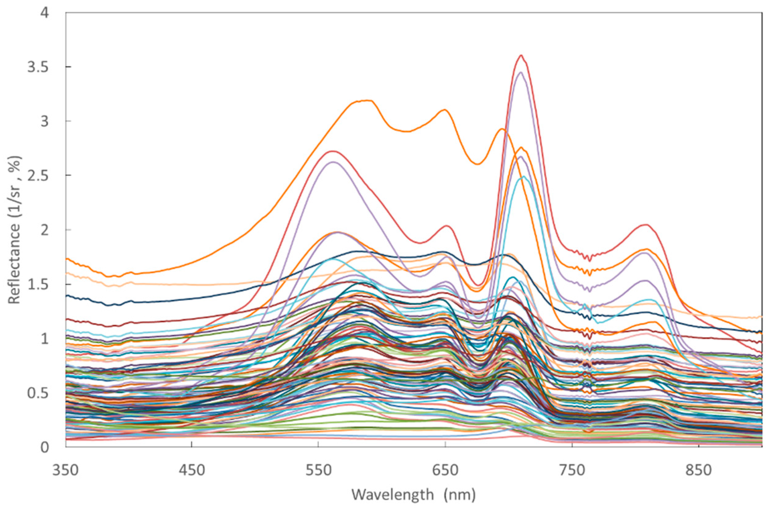 Reflectance spectra of all studied lakes together are presented in Figure 3. Most of the spectra have been collected in lakes with significant cyanobacterial biomass as there is a phycocyanin absorption feature at 620 nm and a peak at 650 nm (Figure 3) typical to only cyanobacteria [11].