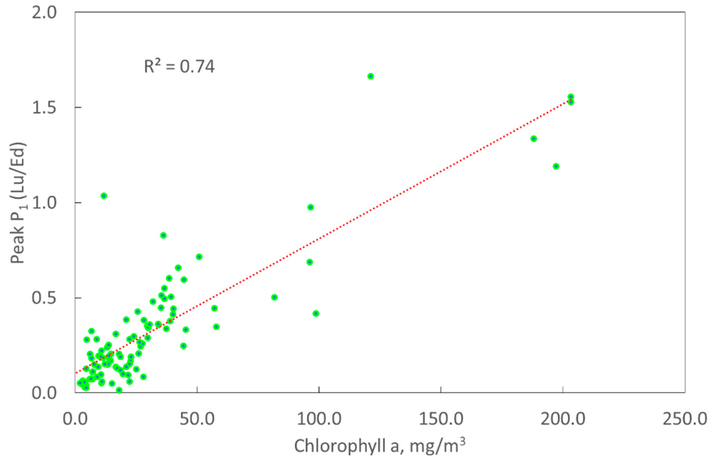 The peak near 710 nm, caused by combined effect of absorption by water molecules and very high reflectance of phytoplankton in the infrared part of spectrum, is often used for chlorophyll-a retrieval in many waterbodies [35,36,37]. Not surprisingly, there was also good correlation between the peak height, P1, and chlorophyll-a in the lakes studied by us (Figure 4).
