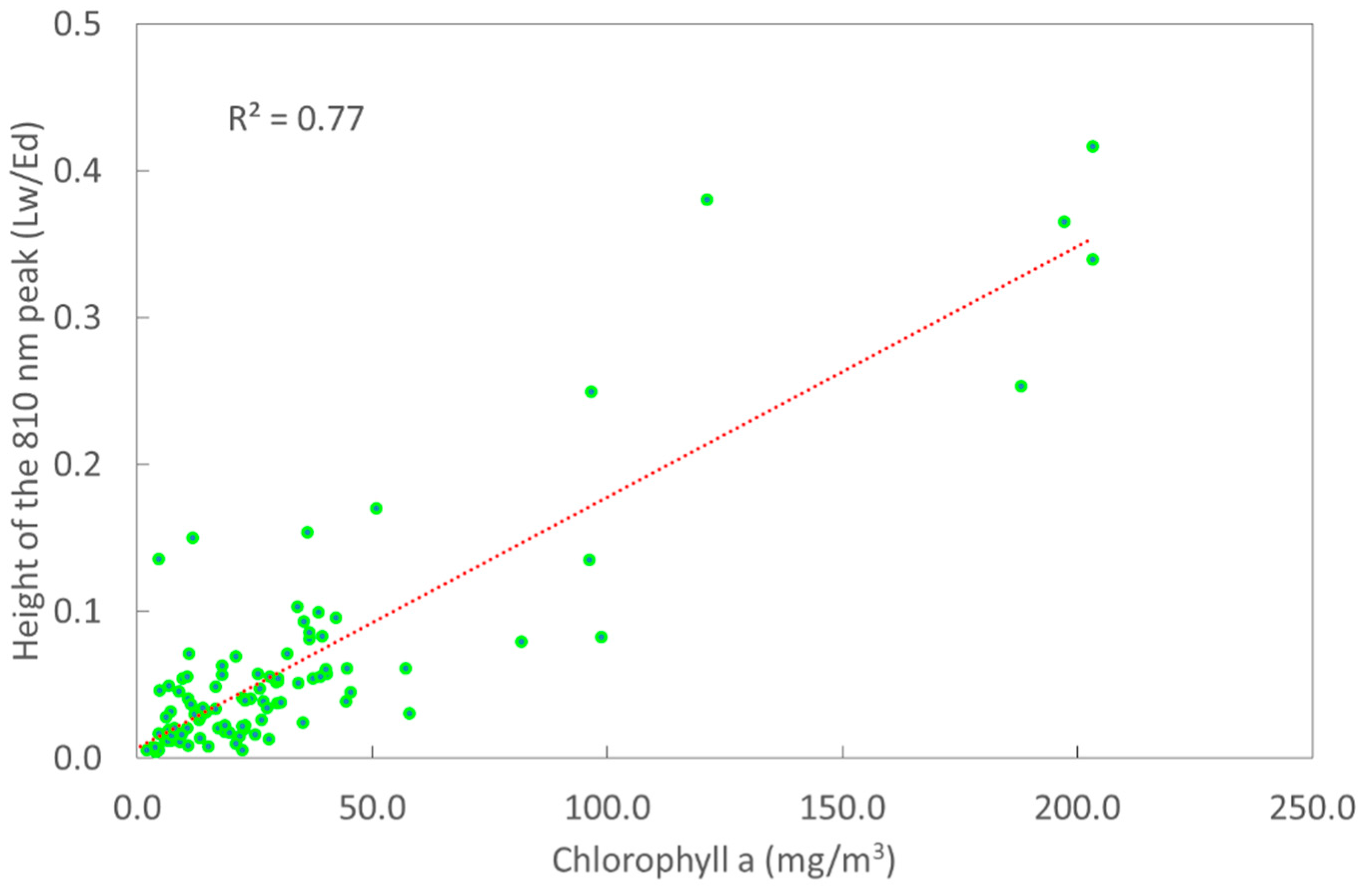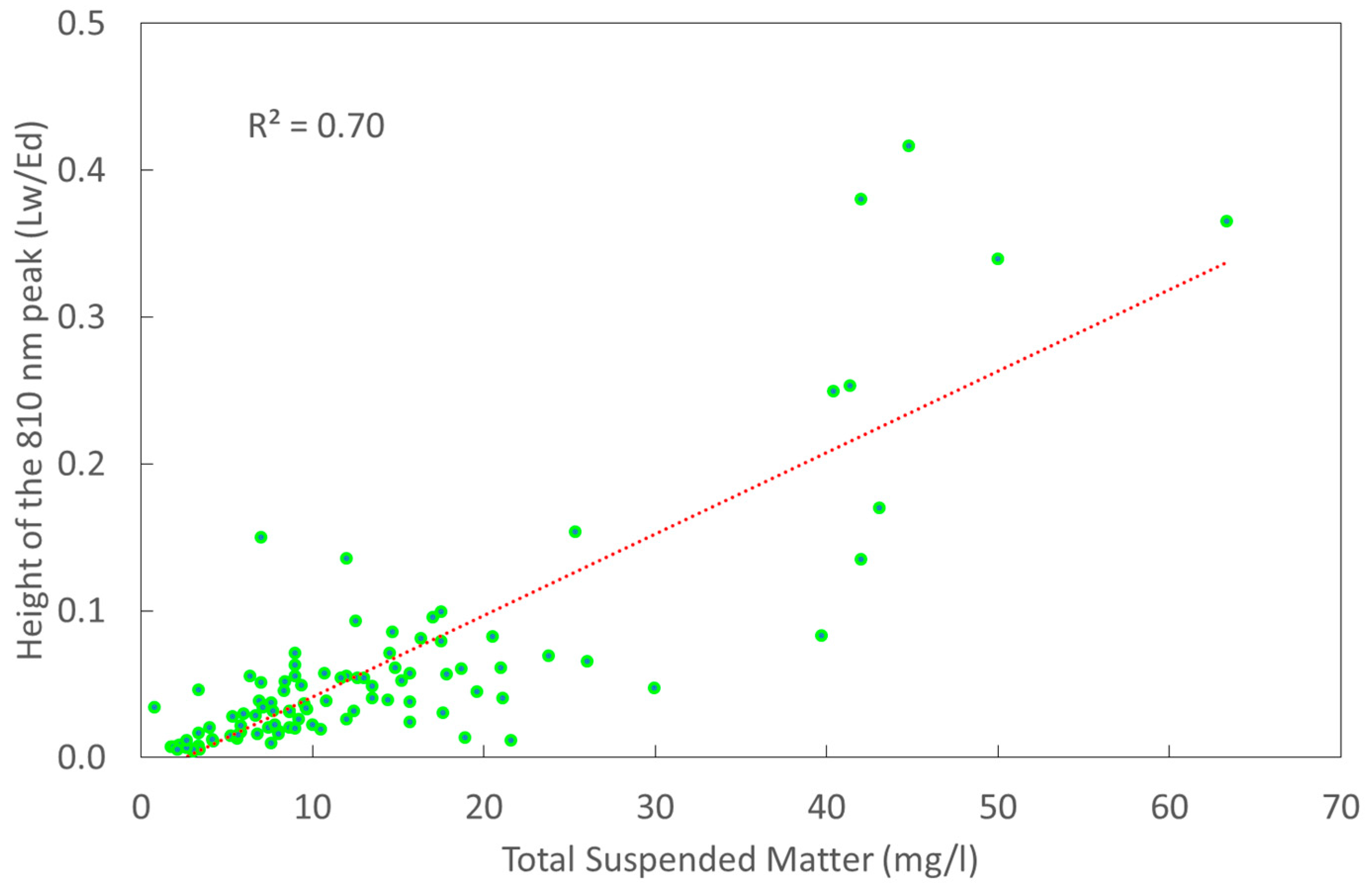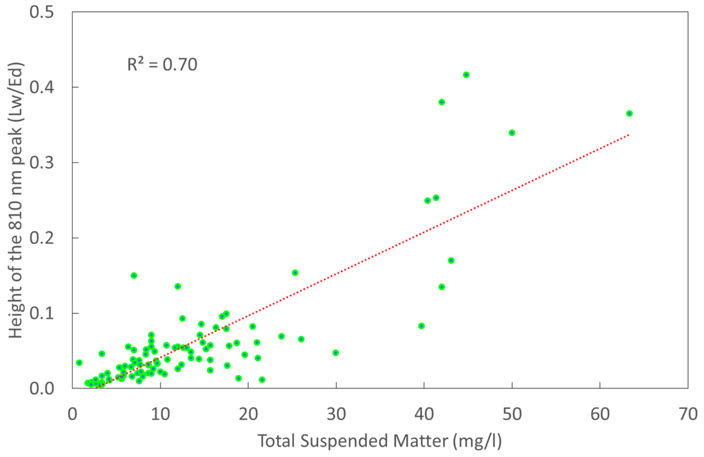 It was not surprising that the height of the 710 nm peak was in good correlation with chlorophyll-a concentration—R2 was 0.74 and 0.72 for above water (Figure 4) and glint free reflectance respectively. However, it was surprising that the 810 nm peak height correlated even better with the chlorophyll-a concentration—R2 = 0.77 (Figure 5). This result was obtained for glint-free spectra. R2 was just 0.37 if the peak height was calculated from the above water reflectance spectra. This stresses the importance of removing glint from aquatic reflectance spectra. There have been studies relating the elevated NIR reflectance values to high mineral suspended matter concentration [8,9]. Therefore, the good correlation between the 810 nm peak and TSS was expected to certain extent.