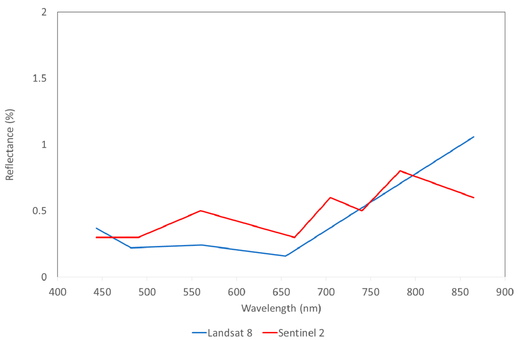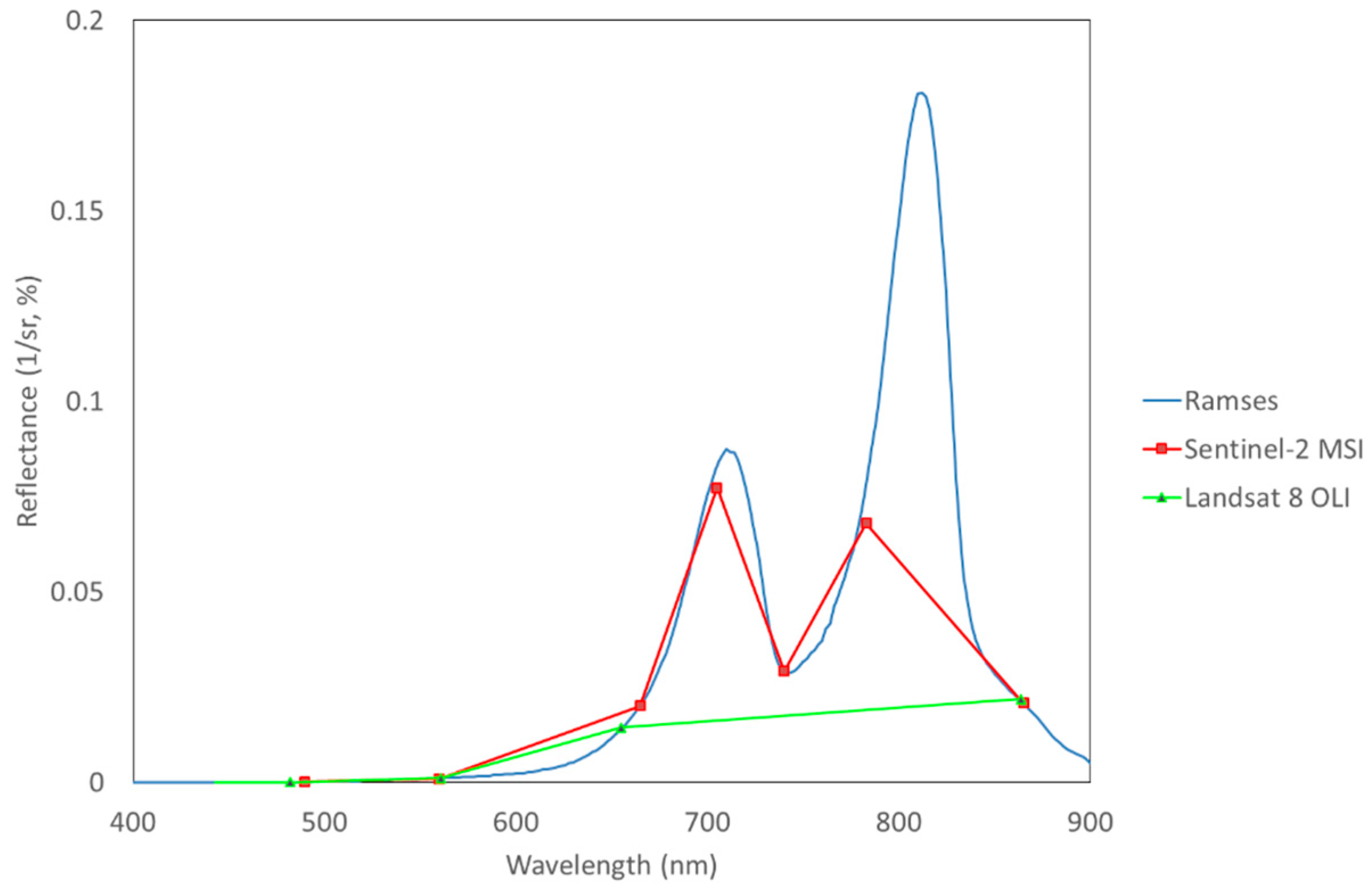 In order to test theoretical performance of Sentinel-2 and Landsat 8 sensors in picking up the two peaks containing information about the water properties in the case of black lakes we took the in situ measured glint-free spectrum of Nohipalu Mustjärv (Figure 2a) and recalculated it using spectral response functions of Sentinel-2 MSI and Landsat 8 OLI sensors. The results are given in Figure 7. It is clearly seen that Landsat 8 band configuration does not allow detection of either of the peaks. Sentinel-2 MSI does not have narrow spectral bands near the 810 nm peak. However, the 783 nm centered band 7 allows to detect the peak to certain extent. Especially, because the bands 6 and 8a are located at wavelengths where the lake reflectance values are low. The 705 nm band 5 of Sentinel-2 is almost perfectly located for detection of elevated biomass in waterbodies as we have also shown in our study focusing on using Sentinel-2 imagery in lake research [28].