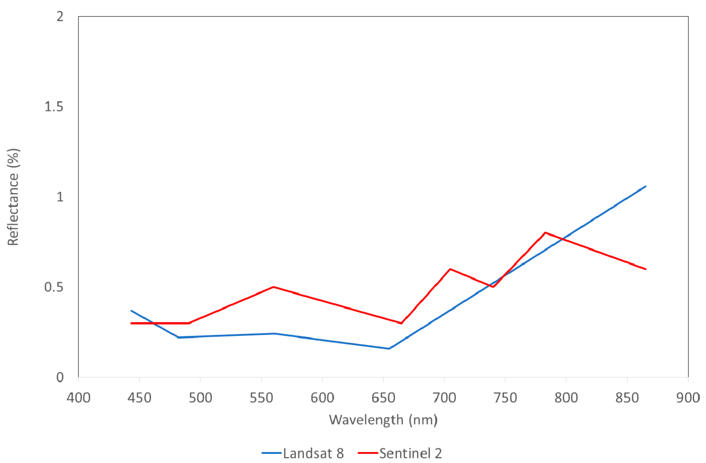 Reflectance spectra of black-water Nohipalu Mustjärv from two different satellites. The Blue line is ATCOR23 corrected Landsat 8 data and red line is Sen2Cor corrected Sentinel 2 data.