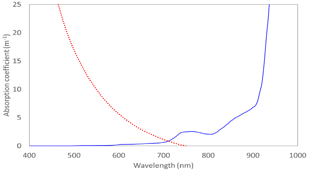 - Pope, R.M.; Fry, E.S. Absorption spectrum (380–700 nm) of pure water. II. Integrating cavity measurements. Appl. Opt. 1997, 36, 8710–8723. [Google Scholar] [CrossRef] [PubMed]