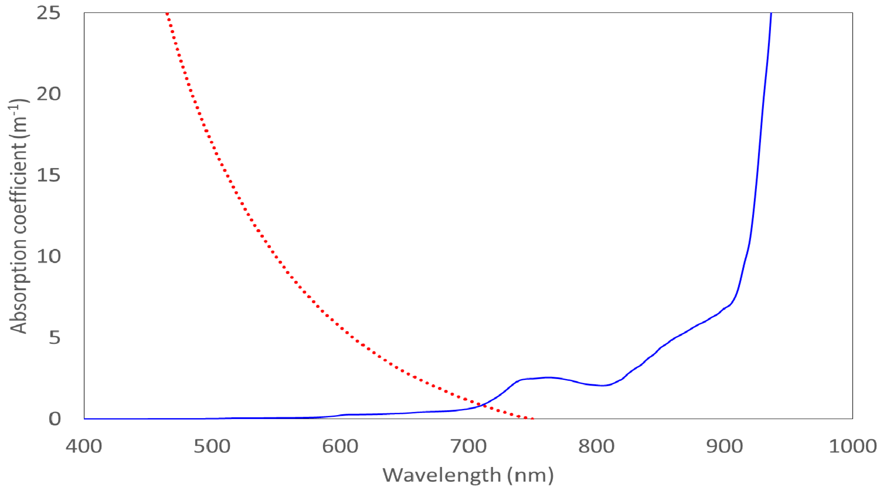Absorption coefficient of CDOM from lake Nohipalu Mustjärv (red graph) and pure water absorption spectrum (blue line) [5].