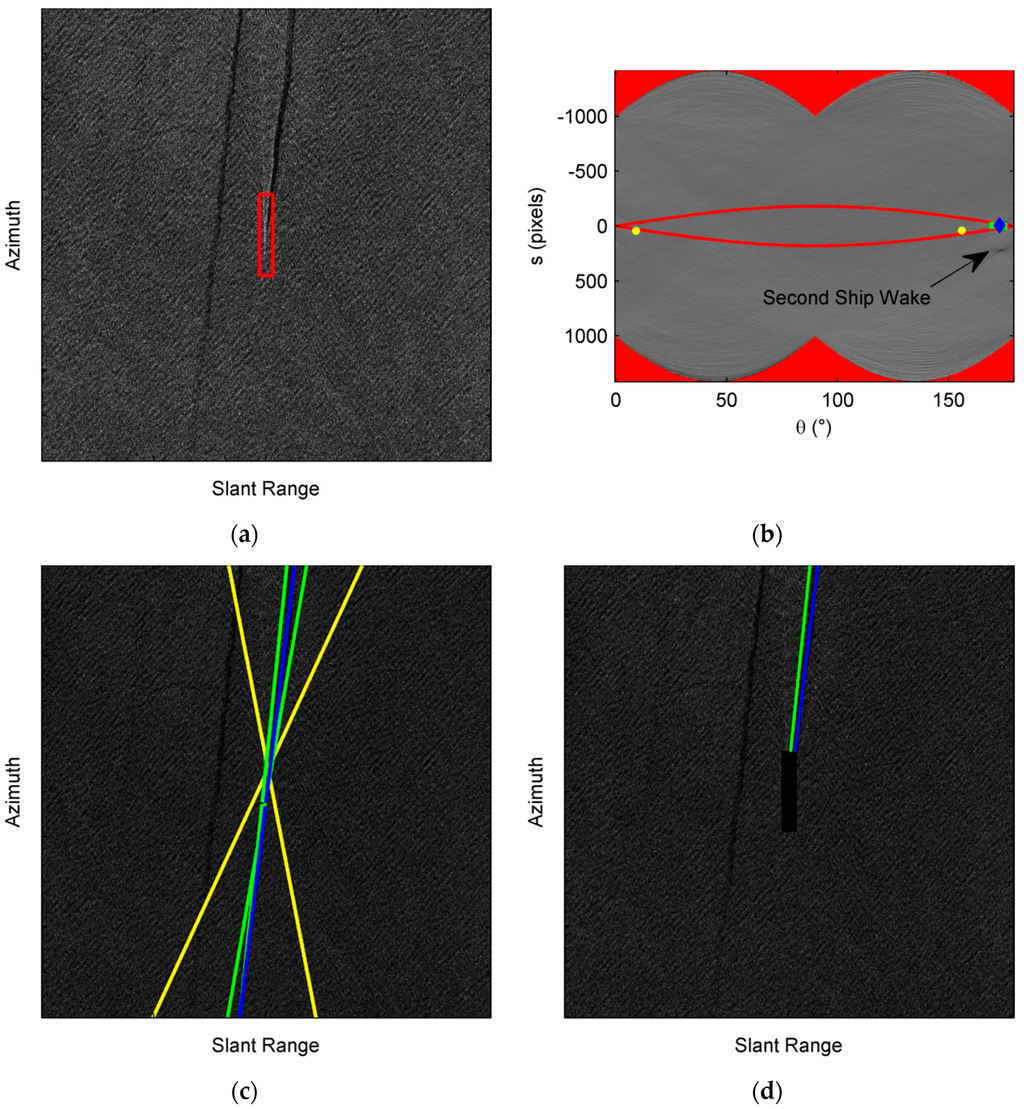The five points are converted into five lines in the input image by the inverse Radon transform (Step 3 in Figure 1), and the 180° ambiguity in ship heading must be solved (Step 4.1 in Figure 1). To this end, the lines of the wake features are intersected with the constant-range line passing through the focused ship location. Then, the turbulent wake is identified as the half-line with lower mean intensity. The narrow-V and Kelvin arm half-lines are identified as the ones within 90° from the unambiguous turbulent wake half-line.