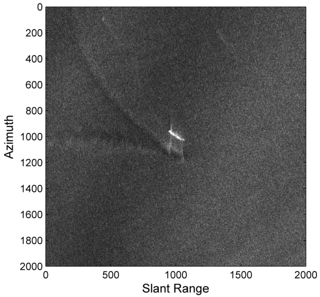 With reference to ship route estimation, the most used and assessed technique is based on the evaluation of the azimuth displacement between ship and ship-wake vertex [11,12,13]. A conventional SAR processor, in fact, erroneously focuses on moving targets, focused with an azimuth offset with respect to their true position, which depends on the target-radar radial velocity [12]. Results on 250 wakes extracted from medium to low resolution SAR data (Radarsat-1, ERS, Seasat) [14] show that the accuracy of the computed velocity is within about ±15 percent of the true speed for most of the images, provided that the wakes exhibit a clear appearance and are not closely aligned with the azimuth direction. A more recent technique is based on the analysis of the Kelvin arms, which exhibit a dark/bright pattern whose wavelength depends on the gravity acceleration and on the ship velocity [15,16].
