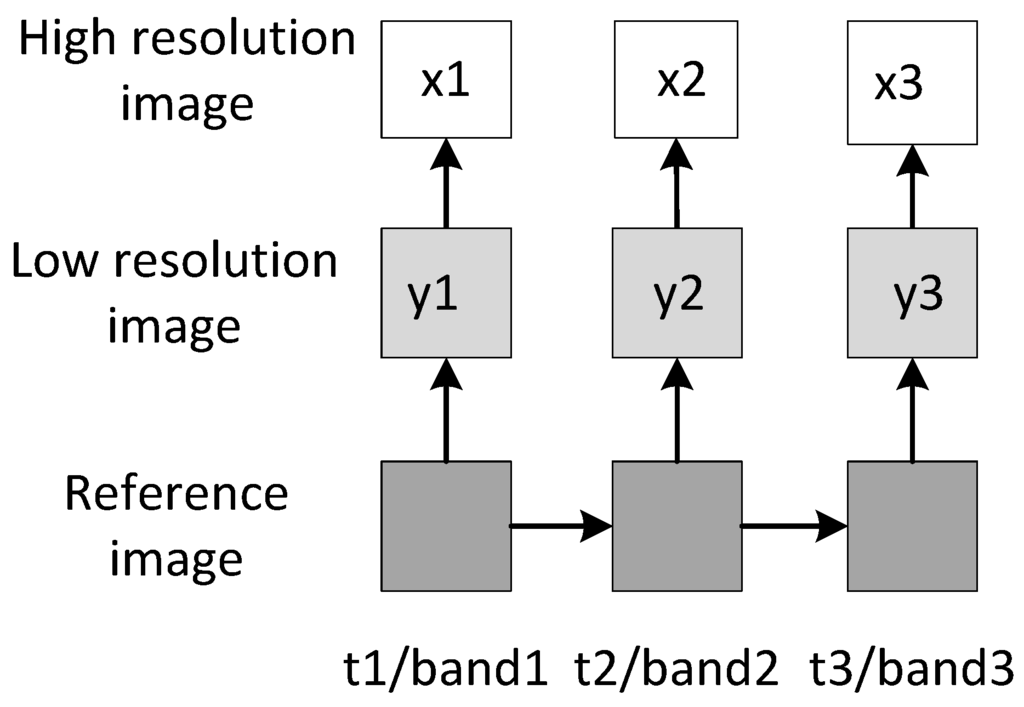 In multispectral remote sensing applications, the target images’ and the reference images’ intensity distributions are different, but their edge directions and texture information are often similar. One of the reference images can be used as a prior image in the reconstruction process. This section gives the generalized nonconvex low-rank approximation algorithm for CS recovery exploiting the nonlocal structured sparsity via low-rank approximation for remote sensing image reconstruction. Let denote the target images, where x is sparsely expressed as with a sparse signal α, and denotes the observed data; the measurement matrix maps x to y. The remote sensing image reconstruction problem is to reconstruct x. Figure 2 shows the relationship between high resolution target images and low resolution observed images. The different low and high resolution images contain different time series or different bands. In some cases, we use one or two different time series or different bands as the reference image and the other as the unknown target image.