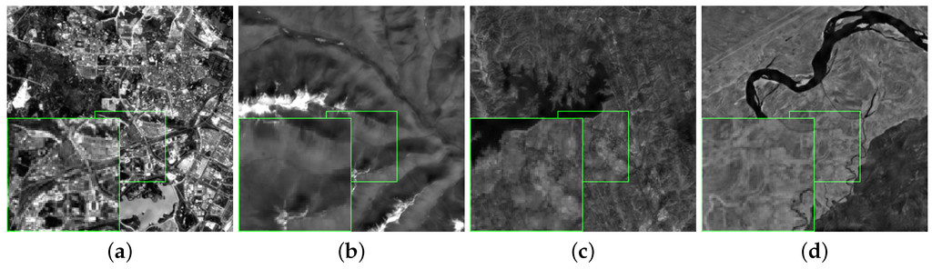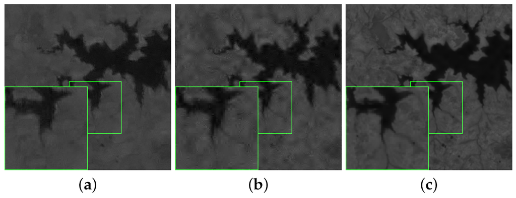 During the experiments, single-channel and multichannel satellite images from MODIS, Landsat 7, Landsat 8 and Google Earth are used as the simulated data to test the performance of our proposed reconstruction framework. (1) Landsat 7 and Landsat 8 provide PAN images at 15-m spatial resolution and 30-m spatial resolution. (2) MODIS provides images at 500-m resolution. (3) Google Earth provides three-channel color tested images. For the Landsat 7 and Landsat 8 image data, Band 4 with 30-m resolution is the near-infrared band with a better spectrum characteristic in which a body of water has a clear outline, and Band 8 is panchromatic with 15-m resolution; thus, Band 4 is chosen as the target image, and Band 8 is chosen as the reference image, which is down-sampled into 30-m spatial resolution to group similar blocks injected into the reconstructed image to compensate the smoothed areas nonlinearly. For the MODIS data, we use Band 4 as the target image and Band 3 as the reference image to evaluate the proposed algorithm.
