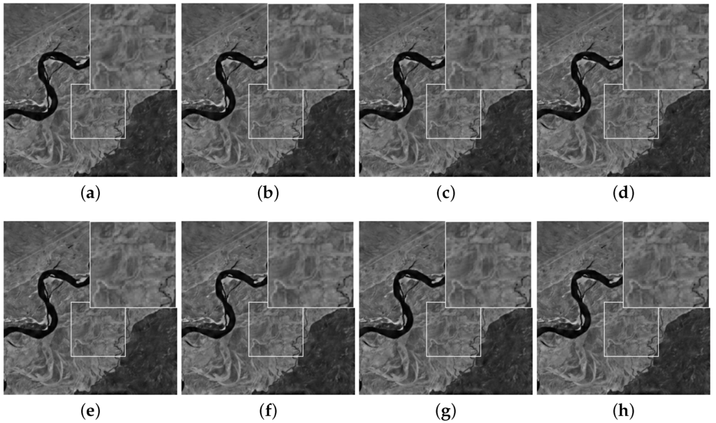 The reconstruction results for a sample rate of 0.1 and a noise level of . (a–d) Reconstructing Landsat 8 images with GNLR-RI-Log, NLR-CS-baseline, CoSaMp and OMP; (e–h) Reconstructing MODIS images with GNLR-RI-Log, NLR-CS-baseline, CoSaMp and OMP. (a) GNLR-RI-Log; (b) NLR-CS-baseline; (c) CoSaMP; (d) OMP; (e) GNLR-RI-Log; (f) NLR-CS-baseline; (g) CoSaMP; (h) OMP.