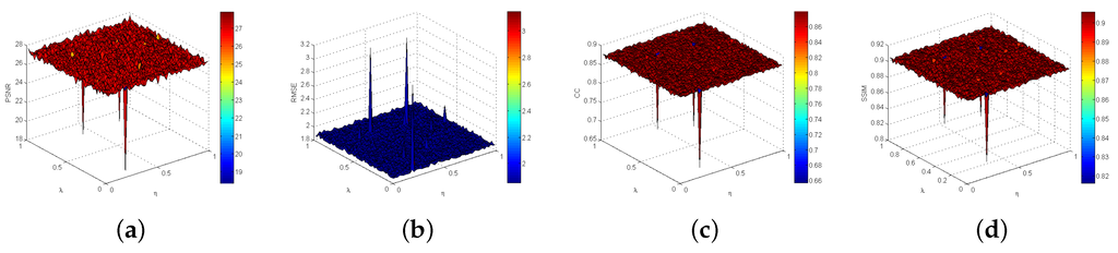 Results of the proposed method with different values of parameters λ and η tested in Bands 4/3 of MODIS. (a) PSNR versus λ and η; (b) RMSE versus λ and η; (c) CC versus λ and η; (d) SSIM versus λ and η.