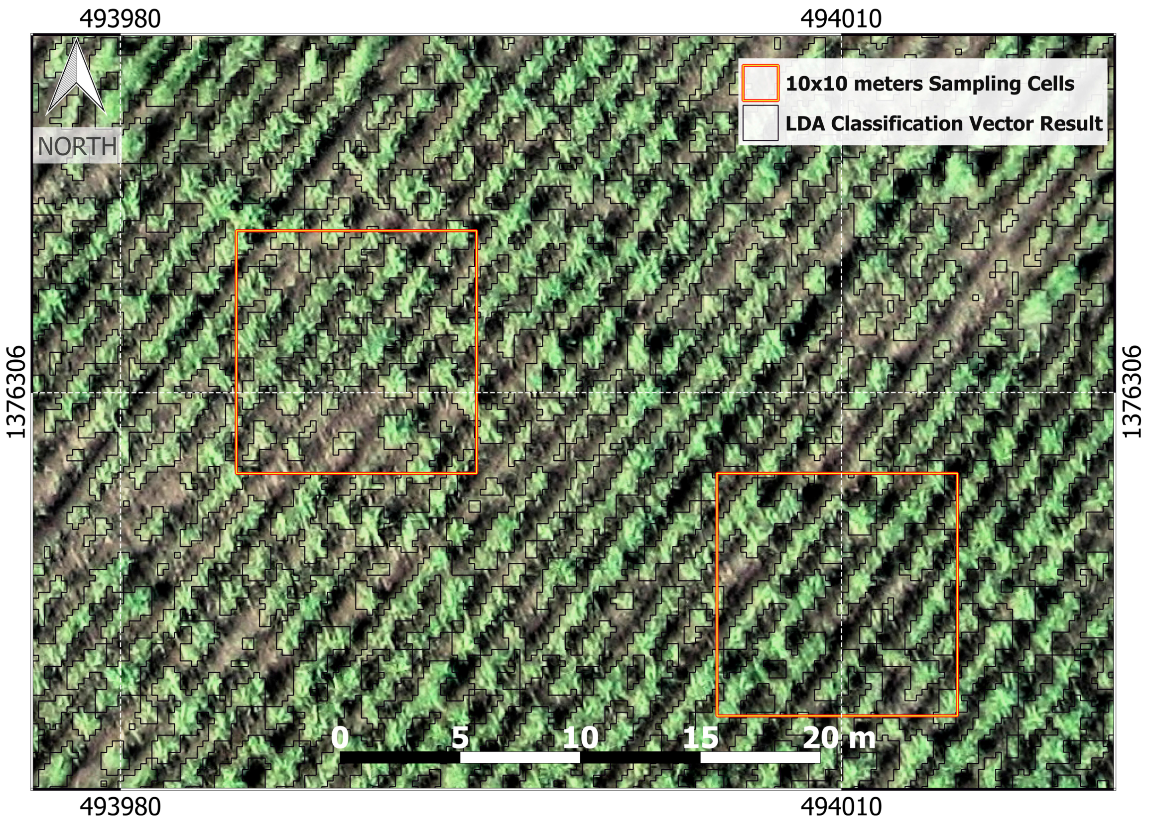 Figure 5 displays the vectorized version of the “Classified Raster Layer” overlaid to a zoomed portion of the full resolution image. The squares represent two of the 25 randomly distributed 10 m × 10 m cells used for the interactive measure of linear gap percentage.