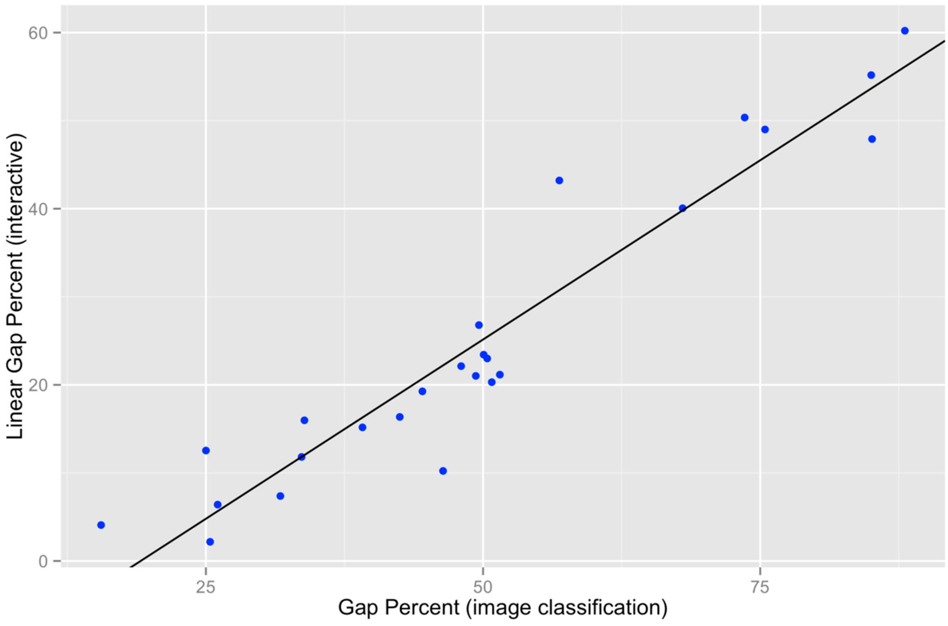 For the random sub-sample of 25 grid cells for which we had previously estimated “Linear Gap Percentage” by digitizing on the 4.7 cm resolution image (see Section 2.5.1):