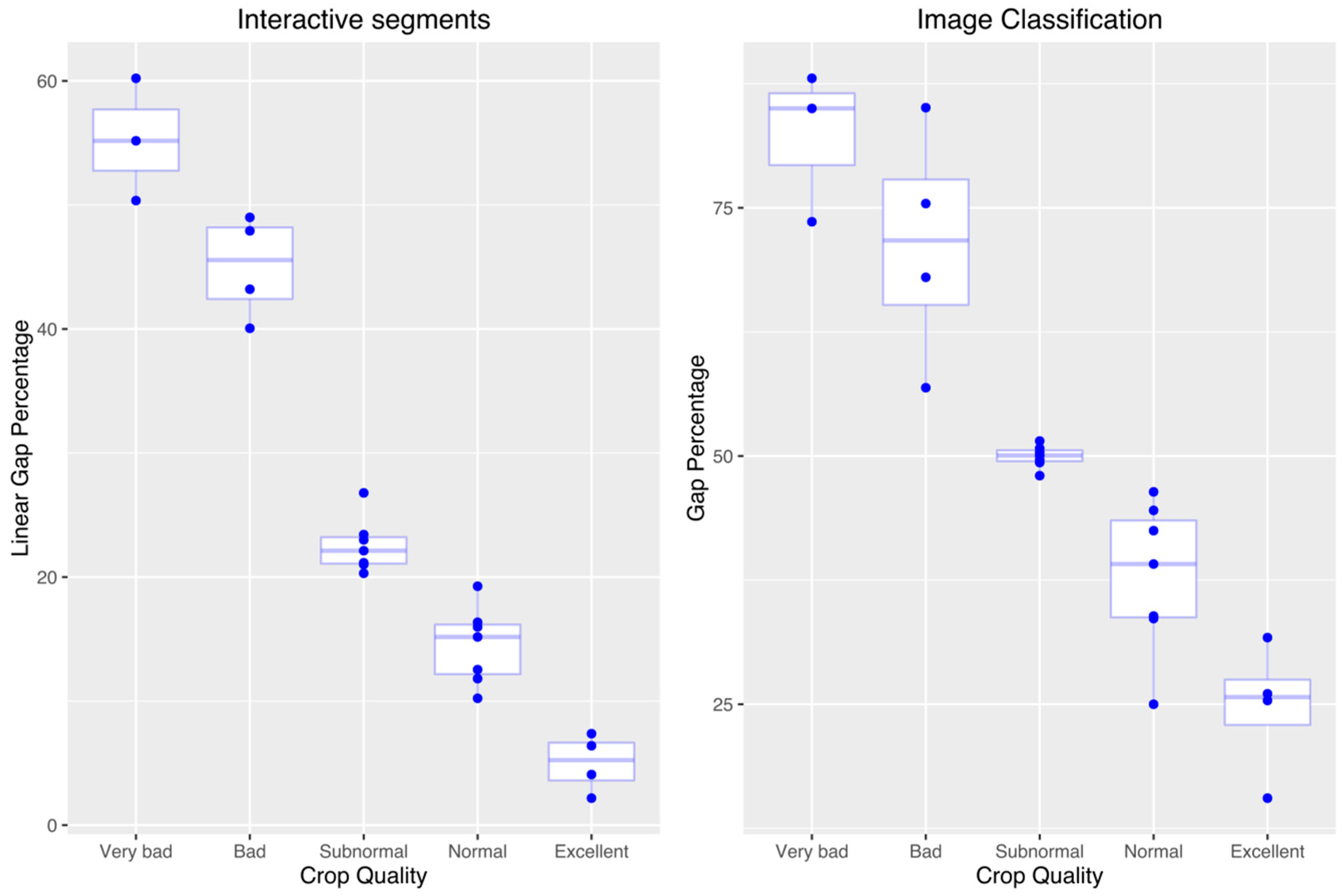 Boxplots of Gap Percentage by Crop Planting Quality Levels for the reference subset of 10 m × 10 m grid cells. (left) values from interactive segments; (right) values derived from image classification. Points indicate values for actual cells.