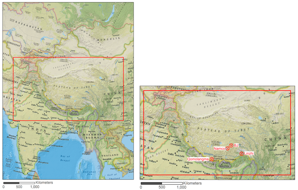 The Tibetan Plateau, lying between the Himalayan range to the south and the Taklimakan desert to the north (Figure 1), is the largest and highest plateau area in the world spreading over 1.2 million km2 and presenting an average elevation over 5000 meters. Ground measurements, coming from four radiative balance stations located on the Tibetan Plateau (Figure 1): BJ (now Nagqu), Linzhi, NamCo, and Qomolangma, are used to evaluate the modelled solar radiation budget estimates. The information concerning the stations’ sites and instruments is taken from Babel et al. [26]. The BJ site is set over relatively flat terrain in a large valley at 4502 m. The vegetation is very low, sometimes interspersed with bare soil, but quite homogeneous on the landscape scale. The nearest hill slopes are located at about 1 km away. The Linzhi station, lying at 3327 m, is located at the start of a small valley in an area covered by an alpine meadow with tall grasses and herbs during the summer period, while the meadows outside of the site are grazed and thus very short. The landscape is very heterogeneous with steep slopes, covered by mixed forest. The pastures outside the fence alternate with a small creek and bushes and single trees, respectively. The NamCo station, at 4730 m, is located on the southeast shore of the NamCo Lake, which is the second largest saline lake in the Tibetan Plateau. The station is surrounded by several mountain ranges, especially the Nyenchentanglha mountain range in the South. The measurement site itself is settled over a flat terrain, and the typical vegetation around the station is an alpine steppe. The Qomolangma Atmospheric and Environmental Observation and Research Station lies at 4276 m above sea level located at 30 km from the Mount Everest. The station is set in a valley enclosed by steep slopes at a distance of 750 m east and 500 m north-west and south-west of the tower with a height of about 600–800 m above ground level. A side valley comes in from the west. The site land cover is dominated by riverbed gravel, with very sparse vegetation, but also small patches of short alpine meadows.
