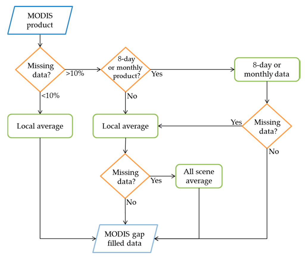 All the data products used during the solar radiative fluxes computation, except for the albedo product, are daily products and include missing data. Thus, a data filling plan was implemented in order to fill the gaps before using the data in the computation. The methodology applied is based on spatial and temporal gap filling. When there is less than 10% of missing data in a scene, local spatial average are used to fill the gaps. When there is more than 10% of missing data and if the corresponding eight-day or monthly MODIS level 3 products are available, the latter are used to fill the gaps. If missing pixels remain after this operation or if no eight-day or monthly MODIS products are available, the average value of the surrounding pixels is used. If there are still some pixels without value, the last option is to fill the pixel with the average value of the whole image (Figure 2). In parallel, a quality flag dataset is produced to provide information about the reliability of the estimates retrieved using those filled datasets.
