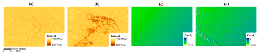 The solar irradiance retrieval methods from remote sensing data are often applied considering flat terrain. Some methods were adapted or new ones developed to take into account the effects of topography on satellite measured data [51,52,53]. Those topographic corrections have been successful in improving the quality of the retrieved surface variables [54,55]. A common procedure applied in many algorithms to take into account topography is to use the average terrain slope and azimuth in the computation of the local illumination angle. In order to integrate the impact of topography, is replaced by the solar incident angle (). is computed at the satellite overpass time and is accounting for the terrain slope and azimuth derived from the DEM [56]. Then Equation (4) becomes: