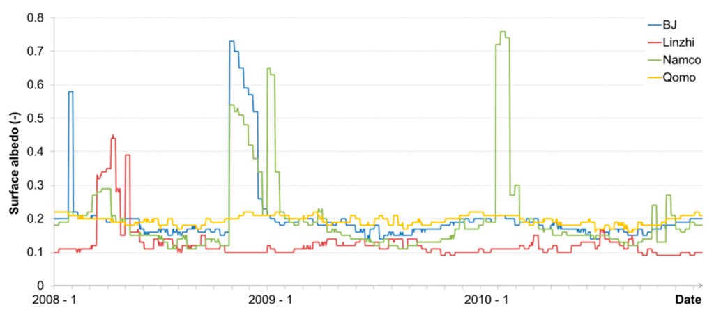 Figure 5 shows that the instantaneous solar incident and reflected radiative fluxes estimated at BJ, Linzhi and NamCo fluctuates more than the one obtained over Qomolangma. One of the reasons could be the lower yearly cloud fraction recorded over Qomolangma, according to the MODIS cloud products. For Qomolangma, the averaged cloud fraction over the three years is about 29%, while it is around 42%, 80%, and 46% for BJ, Linzhi, and NamCo, respectively. As the incident and reflected radiations are correlated, most of the fluctuations are similar. However, some sudden increases in reflected radiation are also observed for BJ, Linzhi, and NamCo stations. As the reflected fluxes (purple line in Figure 5) are derived using the MODIS albedo product, those increases are directly linked to increases of the MODIS albedo values. Figure 6 provides the time series of those MODIS albedo values (MOD43B3) for the same period and locations. From this figure, the same peaks are identified in the time lines. Those high values of surface albedo may be caused by the presence of snow on the ground. Surprisingly, no peak is observed for Qomolangma where snow events usually occur between mid-October and mid-May. This may be due to the fact that it rapidly melts after snowing and seldom lasts more than one day (Wang Zhongyan, personal communication, 31 March 2015). Thus, the MODIS albedo product used in this study, which is an eight-day product, seems to miss those snow events as at least eight individual days of snow were recorded at the station between mid-2008 to the end of 2010.