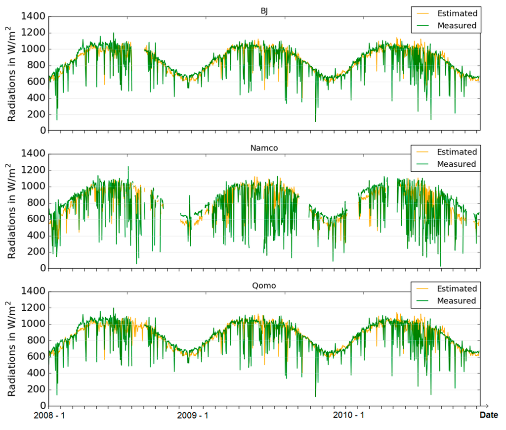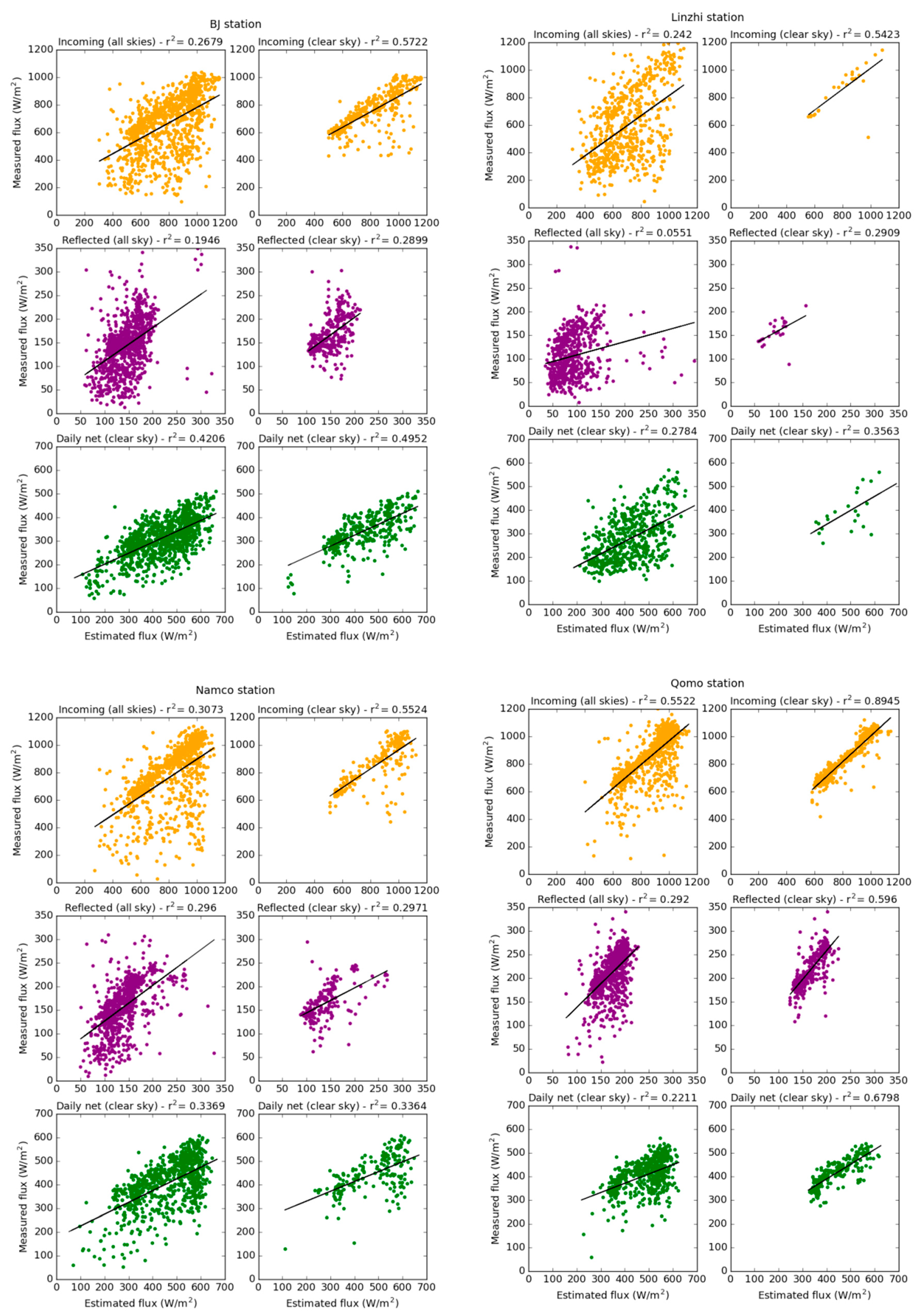 The statistics presented in Table 3 confirm that better results are obtained for clear sky. For all the stations, the instantaneous irradiance is globally overestimated for all skies while it is slightly underestimated for clear sky at NamCo and Qomolangma and overestimated at BJ. The comparison between estimated and measured instantaneous incident fluxes is also presented as a timeline in Figure 8 illustrating the underestimation for clear sky and the overestimation for all skies in NamCo and Qomolangma. On the contrary, the instantaneous reflected fluxes are generally underestimated and more important bias values are observed for clear sky. The RMSE computed for the instantaneous fluxes are relatively high, with less difference between all skies and clear sky for the reflected fluxes. However, it is important to recall that the RMSE penalizes variance as it gives errors with larger absolute values more weight than errors with smaller absolute values [59]. For clear sky incoming fluxes, most of the values are located close to the trend line (Figure 7) while few pixels show large difference between measured and estimated fluxes. Those large differences have a strong impact on the RMSE. Furthermore, part of the RMSE is explained by the bias which is, in some cases, important as compared to the RMSE. The observed bias may be caused by the fact that the instantaneous fluxes are compared to ground measurements interpolated from 30 min average values. As the cloud cover at a specific location can evolve rapidly, its impact on data integrated over 30 minutes can be important [60]. Moreover, at this time of the day, the solar radiative fluxes can increase rapidly in 30 min. Finally, the correlation between estimated and measured instantaneous and daily fluxes is mostly significant at the station of Qomolangma and only for clear sky conditions. The better results obtained at this station are probably due to the more stable weather (less fluctuations in Figure 5) in this area and the lower yearly cloud fraction as presented in Section 3.1. The bias and the RMSE obtained for the validation of the net daily radiations shows values that are coherent with the results obtained for the instantaneous fluxes. It seems that in this case, even if very simple, the sinusoidal function applied for the conversion into daily fluxes does not introduce much more distortion. Moreover, the low difference between all skies and clear sky in this case is explained by the fact that the definition of clear sky is based on the sky conditions at the satellite overpass time.