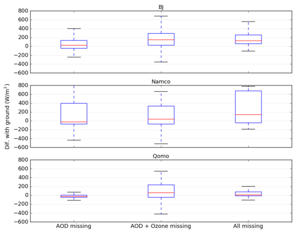 Figure 9 shows that good results are obtained when only the AOD is missing. As explained previously, the impact of AOD is very low on the Tibetan Plateau. The median error and the dispersion of the data increase when AOD and ozone are both missing, except for NamCo where the dispersion remains quite similar. Except in NamCo, the fact that more data than AOD and Ozone is missing does not affect the distribution of the observed errors. The different trend observed at the NamCo station may due to the presence of the lake very close by, influencing the retrieved atmospheric parameters. It is also important to keep in mind that, when data are missing, it is often due to important cloud cover or extreme conditions and, more than the influence of the gap-filling, this can also be the reason of the error increase. It is then difficult to evaluate the impact of the gap-filling procedure applied in this study. Nevertheless, it does not seem to cause an increase of the observed errors while allowing the production of a gap free dataset.