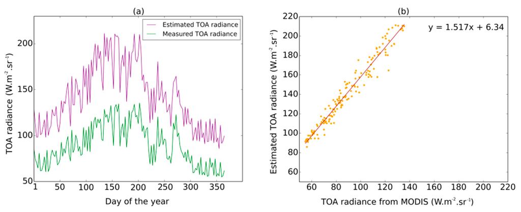 Comparison between TOA reflected radiance estimated using MODIS surface reflectance and TOA reflected radiance measured by MODIS sensor: (a) mean TOA reflected radiance estimated (purple) and measured (green) for the entire study area; (b) the regression between the both mean TOA reflected radiance.
