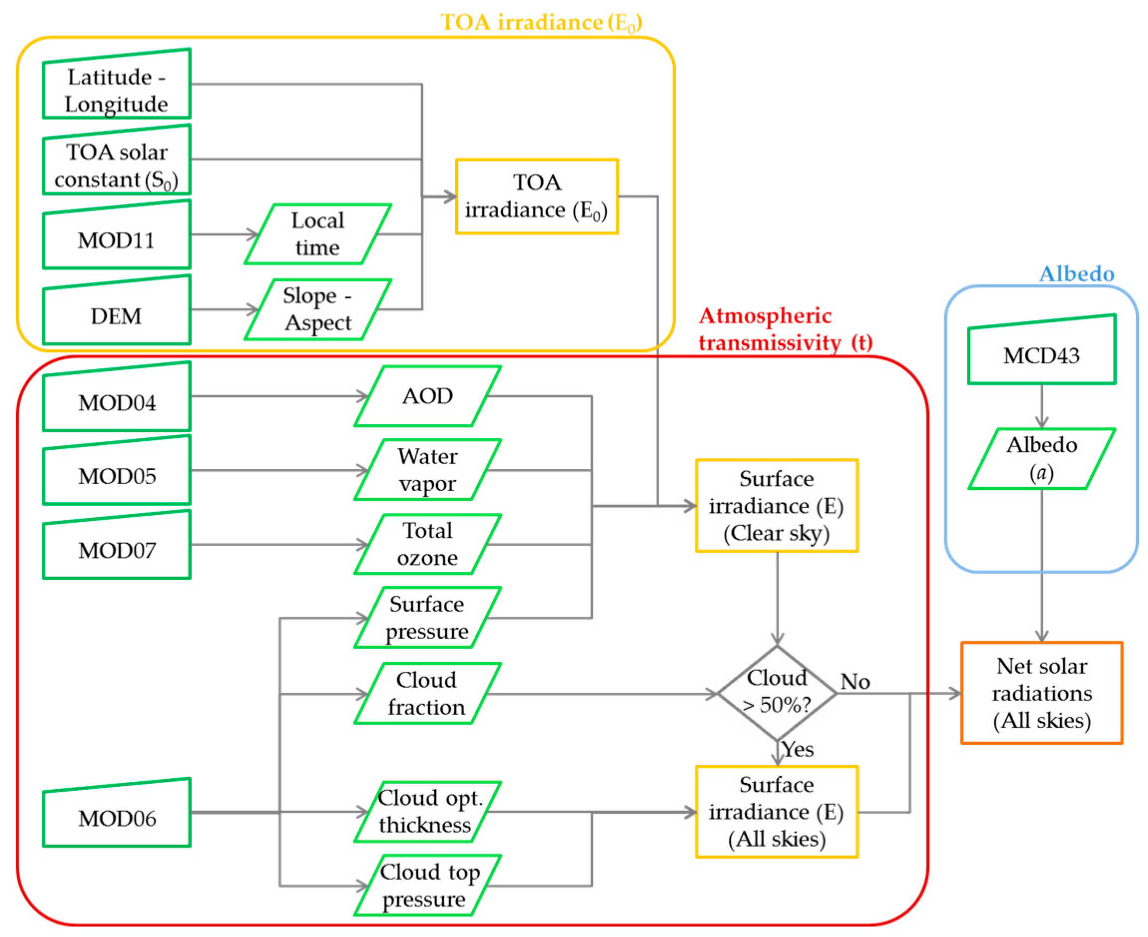 Once the MODIS data products required for the estimation of the solar radiation budget are extracted, registered, and gap filled, the solar radiation budget can be computed in three main steps summarized in the workflow presented in Figure 3. First the TOA irradiance is calculated using the latitude and longitude values of each pixel, the solar constant corrected for the sun-earth distance, the satellite overpass time derived from MOD11A1 and integrating the slope and aspect of the terrain derived from the DEM. Second, the atmospheric transmissivity is computed for clear sky using the surface pressure, AOD, precipitable water, ozone thickness extracted from MOD06, MOD04, MOD05, and MOD05, respectively. Combined with the TOA irradiance, the surface irradiance is computed for clear sky. An atmospheric transmission factor for all sky conditions is also computed based on the cloud top pressure, the cloud optical thickness and the cloud fraction extracted from MOD06. Finally, the last step consists in deriving the blue sky albedo from MCD43B3 black and white-sky albedos and combining it with the all skies irradiance to estimate the solar radiation budget.