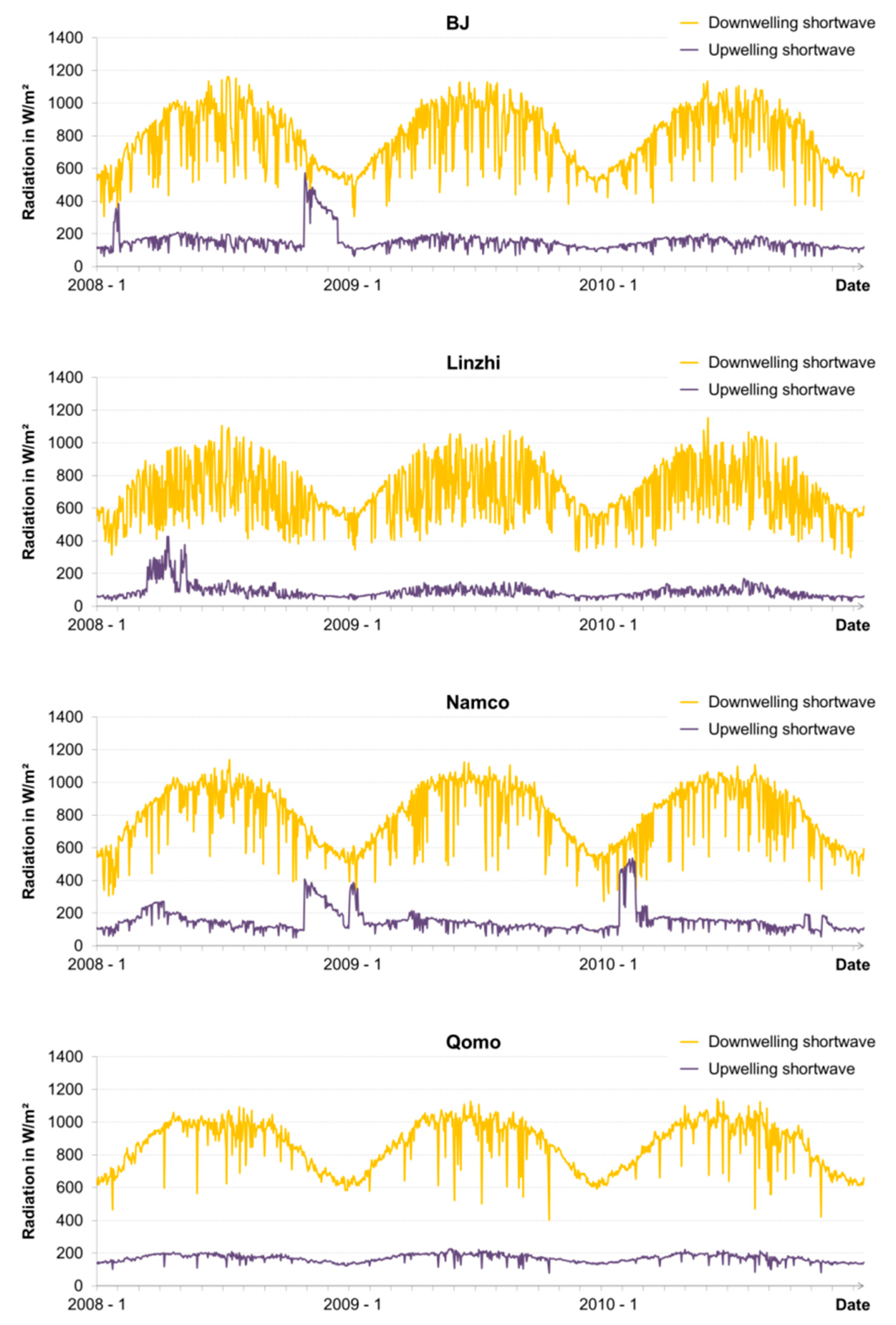 Time series of instantaneous solar incident (yellow) and reflected (purple) radiations for the pixels in which the ground stations used for the validation are located: BJ, Linzhi, NamCo, and Qomolangma (Qomo).