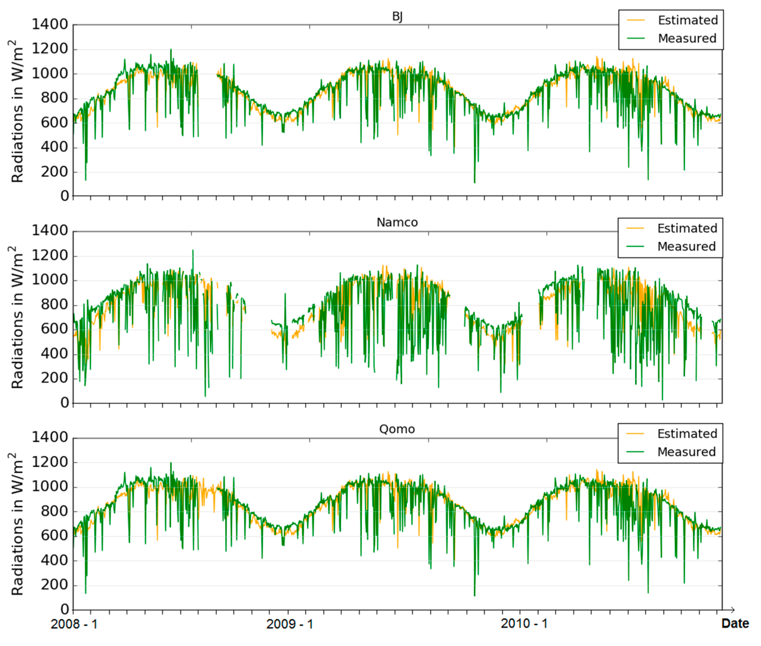 Time series of estimated (yellow) and measured (green) instantaneous solar incident radiations for each of the pixel used for the comparison with the ground stations of BJ, NamCo, and Qomolangma (Qomo).