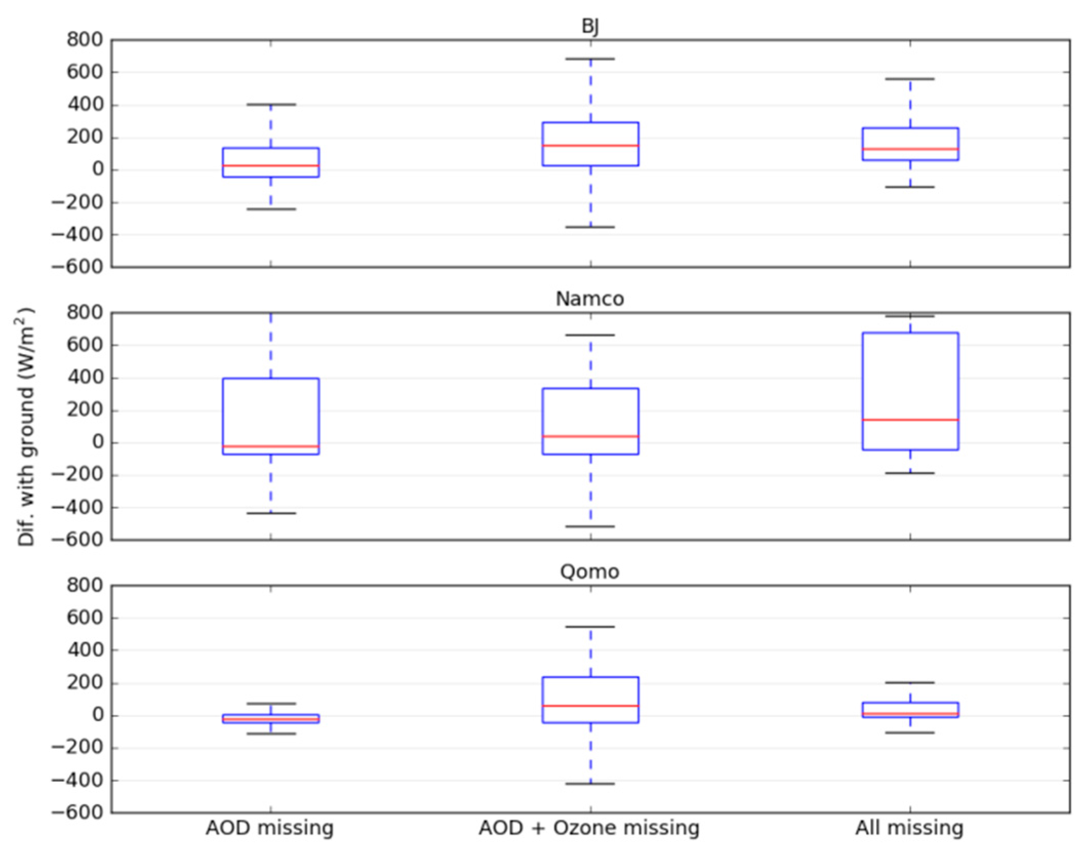 Comparison of the differences in W·m−2 between estimated and measured instantaneous incoming fluxes at BJ, NamCo, and Qomolangma (Qomo) according to the input missing during the computation.
